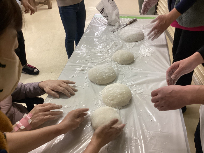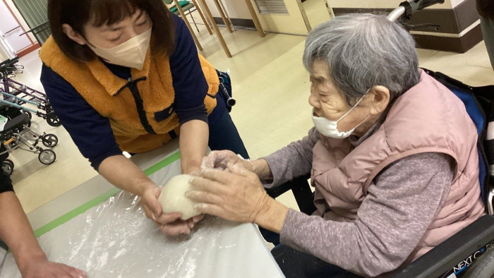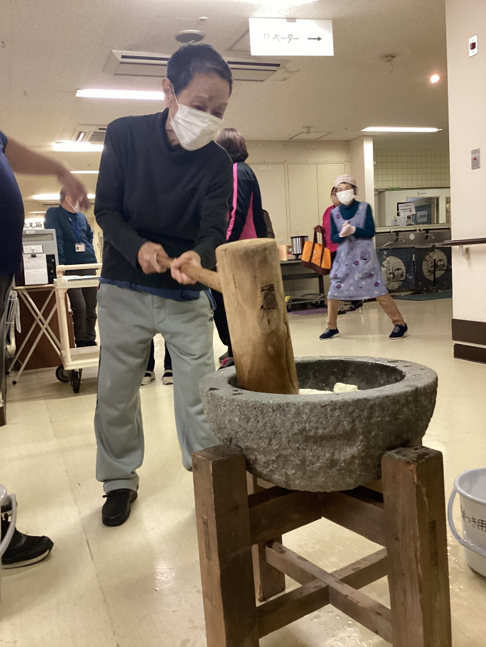 さぬき 2024.12.27 【養護】餅つき お正月用に餅つきをし、かがみもちを作りました!(^^♪ とーってもいい匂いに蒸しあがったもち米を、皆で代わるがわる杵を振りかざすとお餅になりました。 取り分けたお餅を片栗粉で真っ白になりながら丸め、たくさんのかがみ餅になりました。 うらじろや橙を飾りつけ、お正月準備が整いました(o^―^o)ニコ