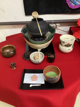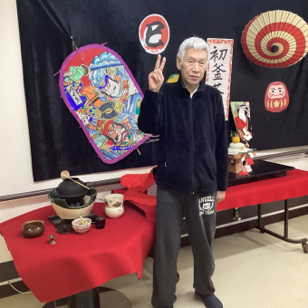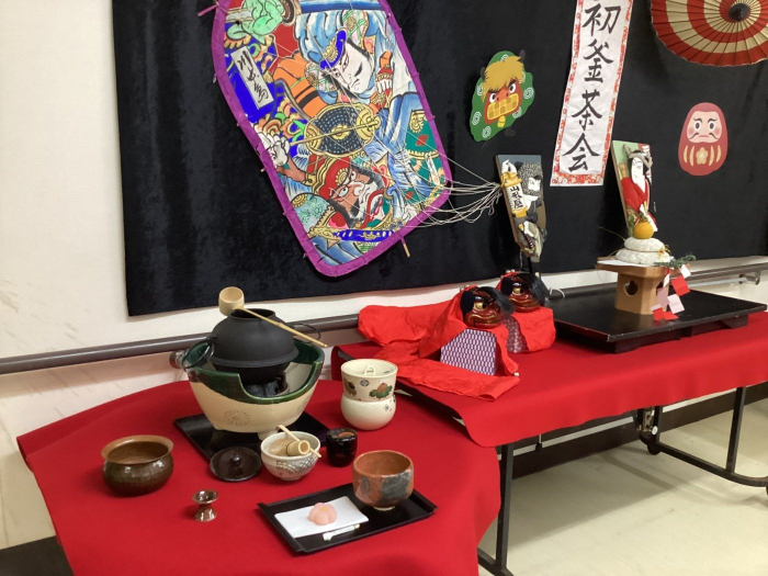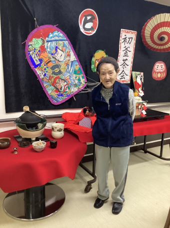 さぬき 2025.01.10 【養護】令和7年初釜茶会 今回も月見茶会に引き続き、三友堂さんから「紅梅」のお菓子を注文し、入居者様に振舞いました(^_-)-☆ 大変喜んで下さり、快く記念撮影にも応じて下さいました(*^-^*)