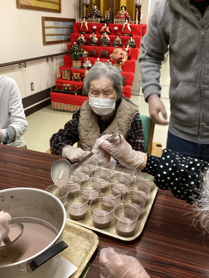 さぬき 2025.02.08 【養護】料理クラブ(ババロア) 2月はバレンタインデーとのことでチョコレートのババロアを作りました(^^♪ 利用者様にとても好評で、「これは美味い!おかわりはないん?」と何人もおっしゃる方がいました(^_-)-☆