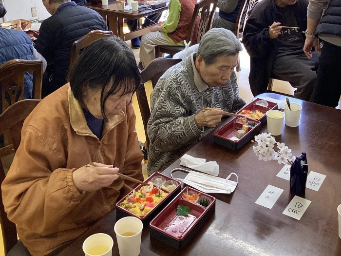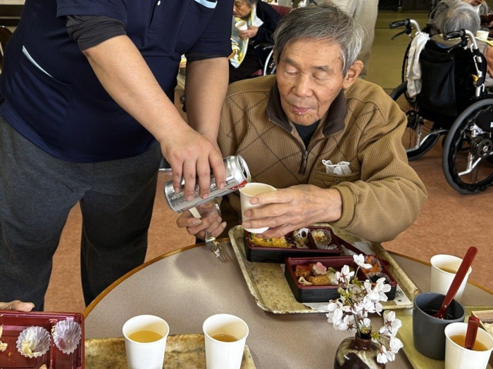 さぬき 2025.04.04 【養護】花見会 毎年恒例の花見会を行いました(^^♪ 桜を見ながら、花見弁当を食べました(^^♪ ジュースやノンアルコールビールを「久々にビール飲んだら酔いそうやわ!」笑顔が見られてます(^_-)-☆
