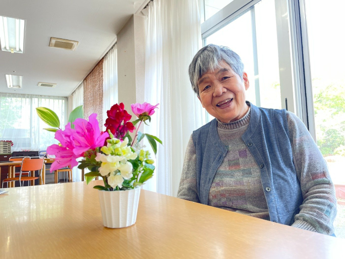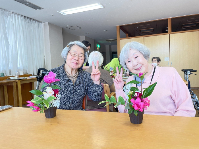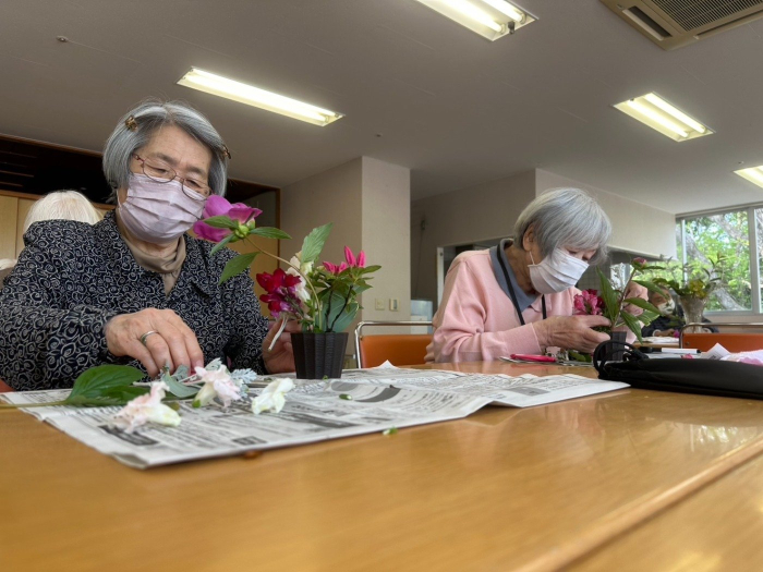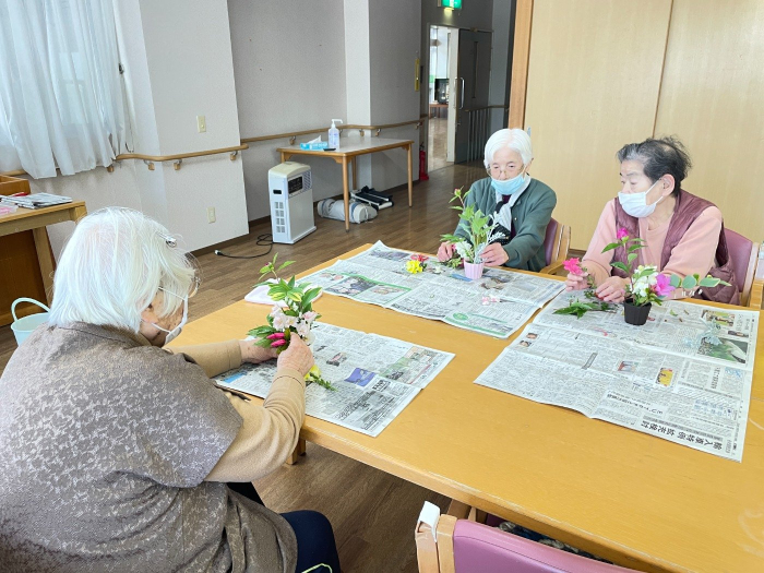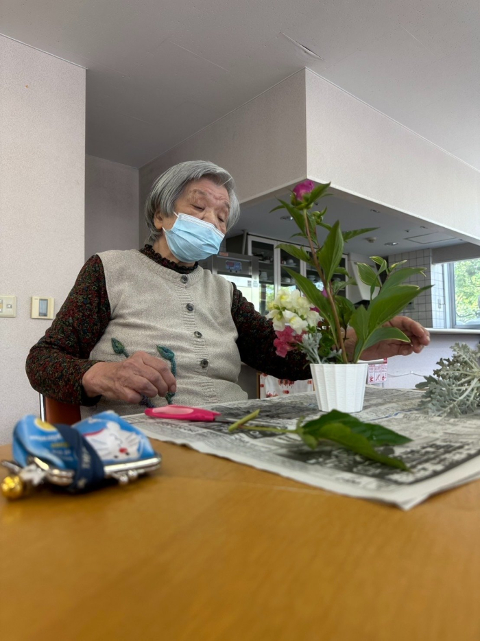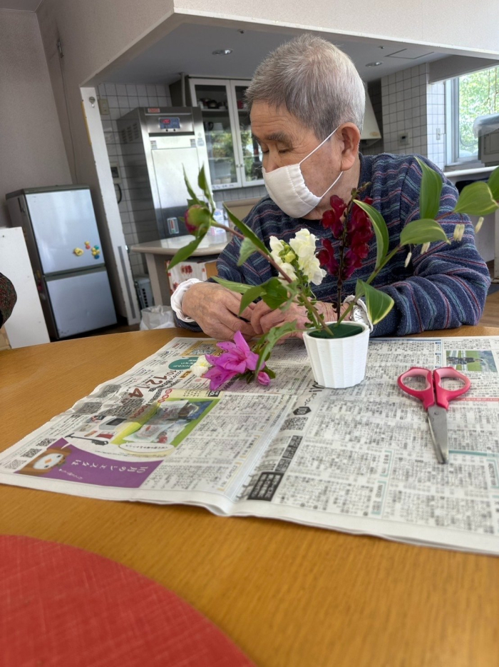 ケアハウスの周りには沢山のお花が色鮮やかに咲いています。先日、咲いているツツジや金魚草、芍薬等を使ってフラワーアレジメントを行いました。