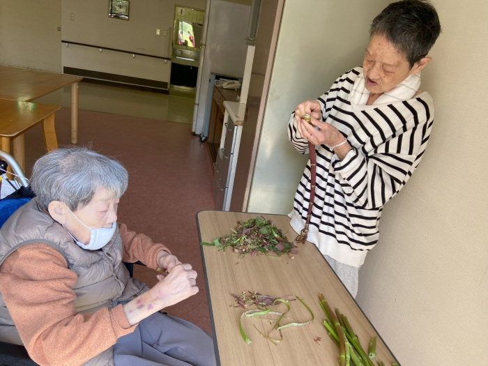 さぬき 2025.04.22 【養護】今日のひと時(いたどり) いたどりの煮物!!美味しくいただきました(^_-)-☆ ①皮をむく ②サッと湯がく ③水にさらす ④薄味で煮て、最後に花かつおでできあがり!!