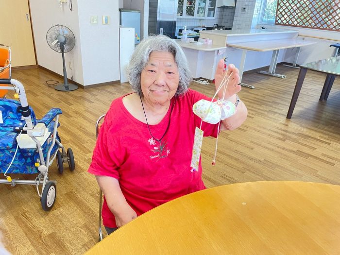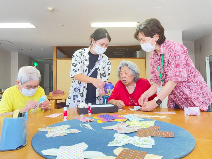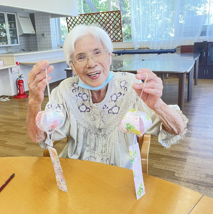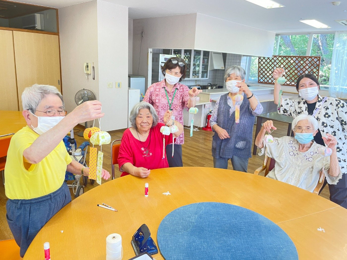 さぬき 2025.07.29 【ケアハウス】風鈴作り 7月も残り少なくなりましたね。今年も暑い日が続いていますが、皆さんのお体の具合はいかがでしょうか? ケアハウスでは、この暑い夏を涼しい音で乗り切ろう!と風鈴を作ってみました。 型をとった折り紙に丸みをつけたり、小さな穴に糸を通したりと、細かい作業が続き、最初は苦戦されていましたが、隣の席の方と助け合いながら、綺麗な風鈴ができました。