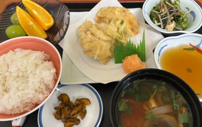 さぬき 2025.08.11 【8月 地産地消】 【献立】 ・ご飯 ・はもの天婦羅 ・天つゆ(もみじ) ・赤だし汁 ・あっさり酢の物 ・果物(シャインマスカット・オレンジ) ・漬物 【産地紹介】精白米(こしひかり100%)・はも(香川)・アスパラ(綾川)・きゅうり(志度)・たまねぎ(三豊)・シャインマスカット(志度)を使いました。旬のはもやシャインマスカットなど、夏ならではの献立が、皆さまに大好評でした。しっかり食べて、まだまだ続く暑い夏を乗り切りましょう!!