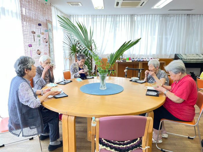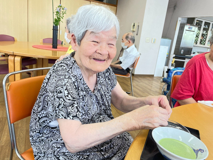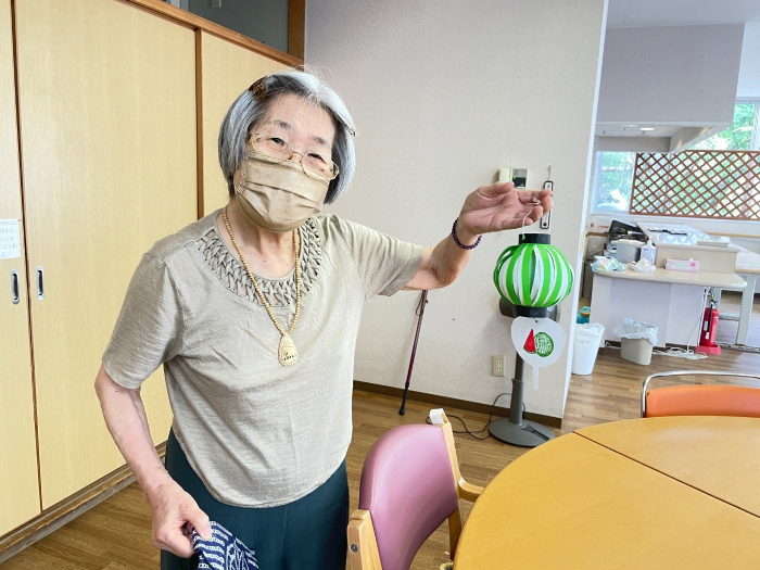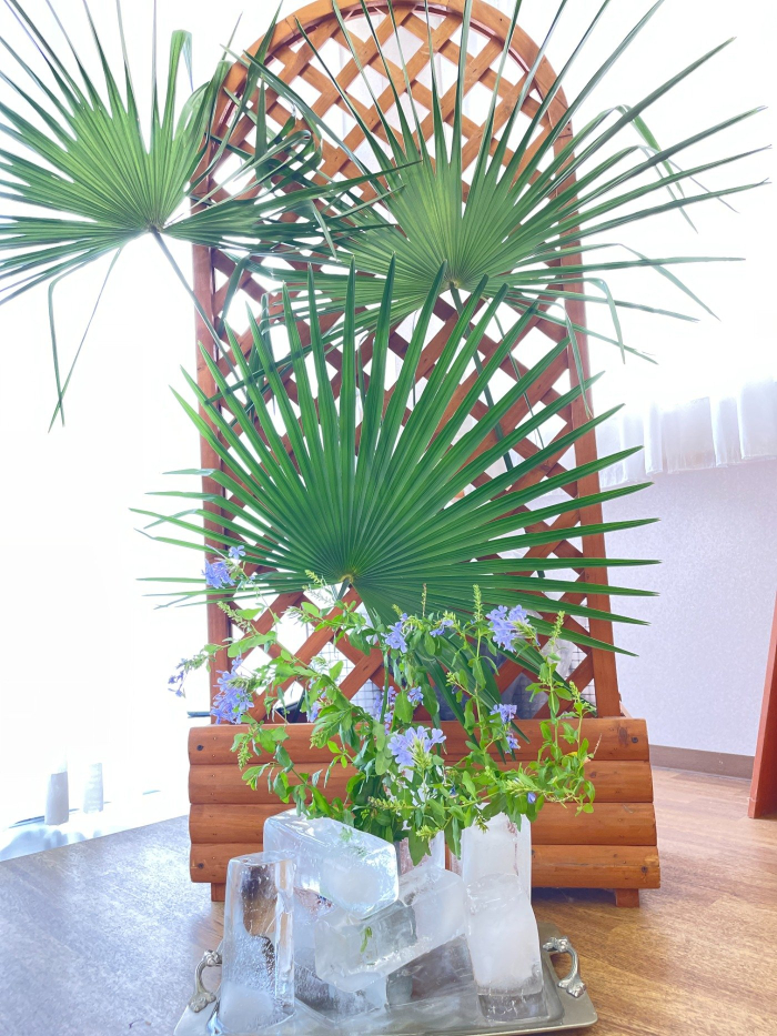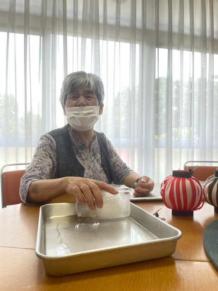 途中で涼しんでもらおうと、シュロの飾りに使用していた氷を触ってもらったところ、「うわー!冷たい!でも気持ちいいわ。」と楽しまれている姿も見られました。