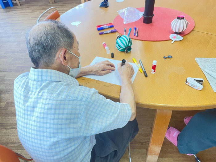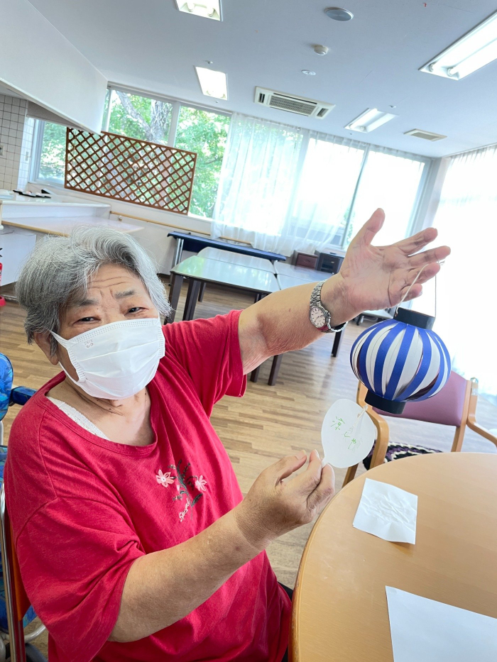 うちわ型の房に、文章やイラスト等を描かれ、予め作っておいた火袋に繋げて、十人十色の提灯ができました。その後、数名の方は火袋作りにも挑戦され、色鮮やかな提灯がたくさんできました。