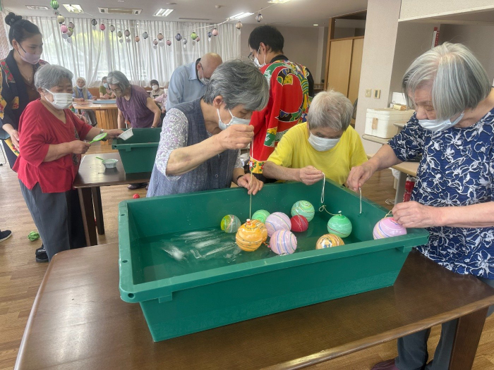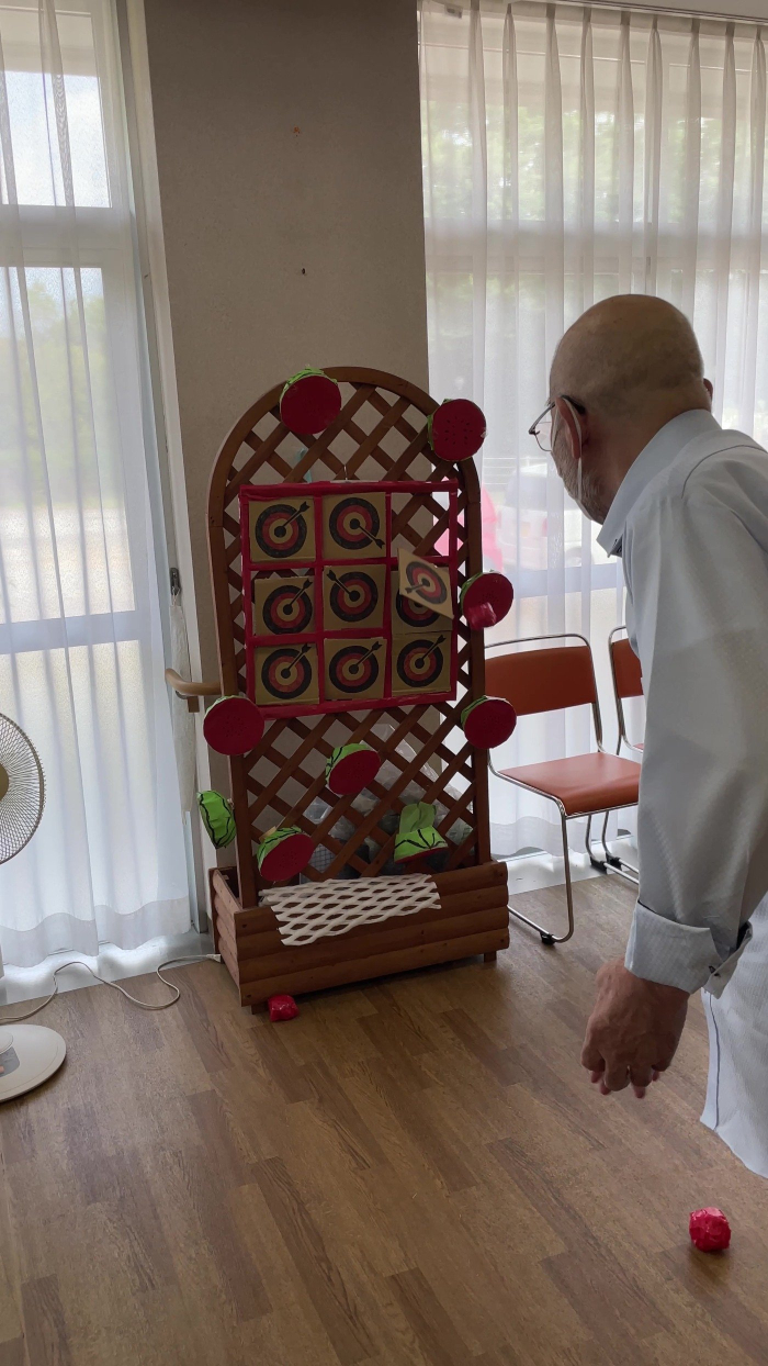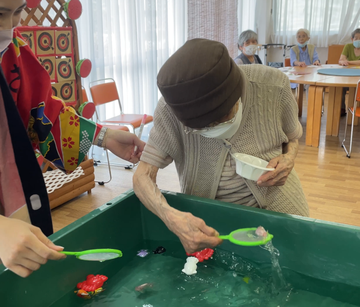 割れたスイカでデザートを作っているあいだに、利用者様は金魚すくい、ヨーヨー釣り、的当てを楽しまれていました。今回の金魚すくいは生きた金魚も入っていましたが、入居者様は上手にポイを使いどんどん金魚をすくっていくので、職員は驚くばかりです。