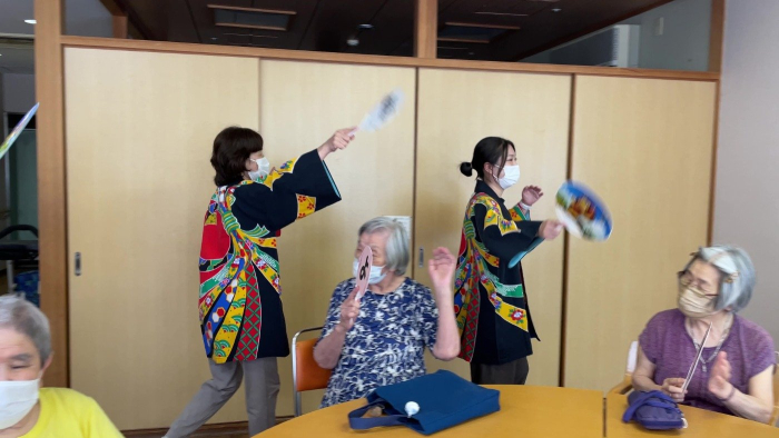 職員が一合まいたを踊りながら入場すると、利用者様も音楽に合わせて手拍子されたり、その場で踊ってくれる方もいらっしゃいました。
