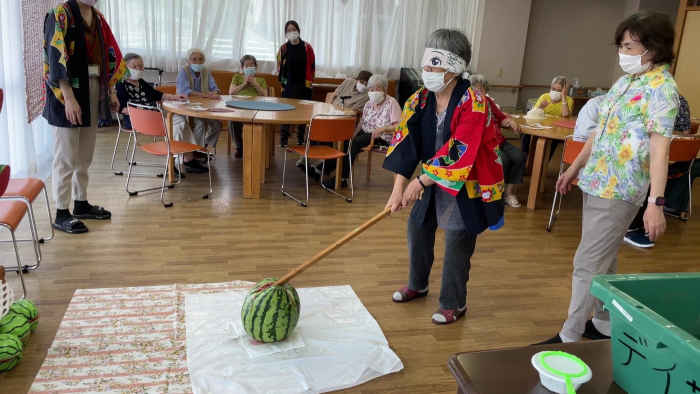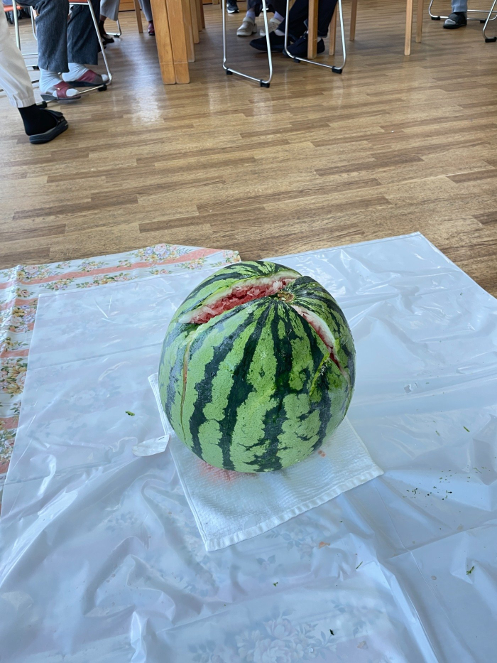 その後は数名の利用者様にスイカ割りを行ってもらい、割れた時には大きな歓声が沸きました。