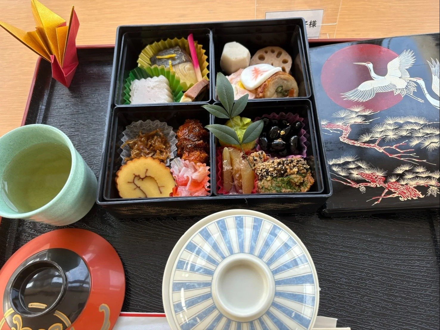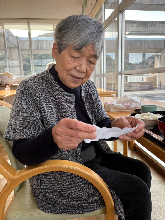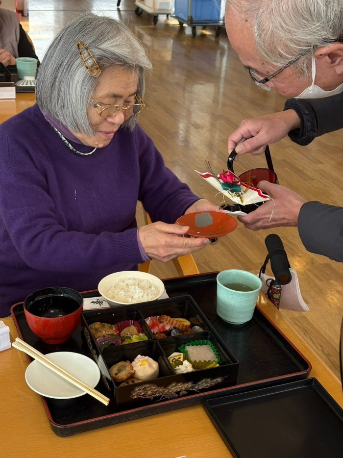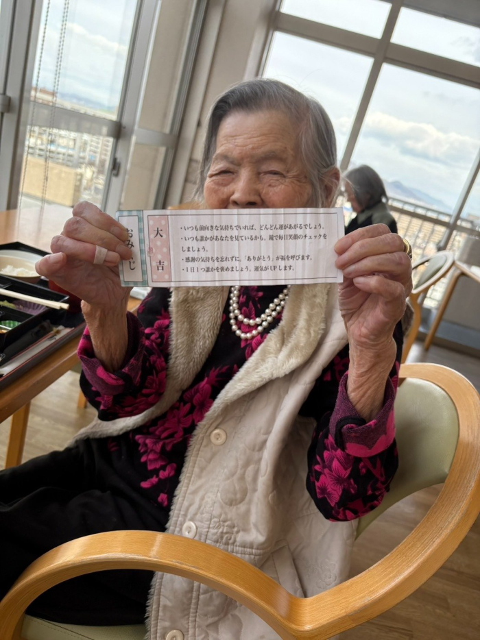 ケアハウスでは元旦に石清尾八幡宮へ初詣に行ってきました。元旦とあって参拝者の方が多かったですが、ケアハウスの利用者様は元旦から初詣に行けたと喜ばれていました。また、同日の昼食はおせち料理でした。お重の蓋を開けると「うわー!豪華やなぁ!」「凄いな。」「美味しそう!」と笑顔がこぼれていました。その後、無病長寿を願って園長よりお屠蘇を振舞わせていただきました。また、お正月を存分に味わってもらおうと、手作りのおみくじも引いてもらいました。大吉が出た時には満面の笑顔!頑張って作った甲斐がありました。