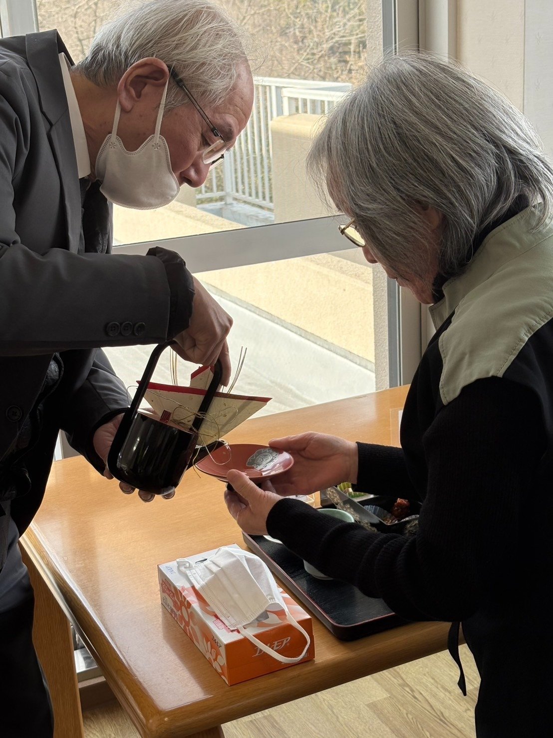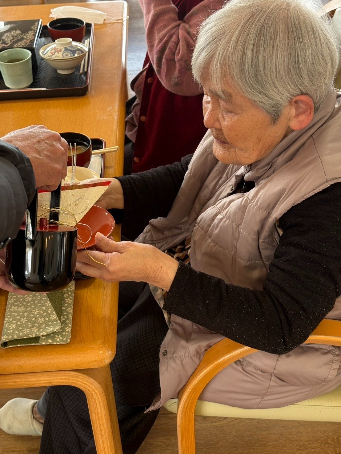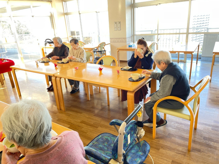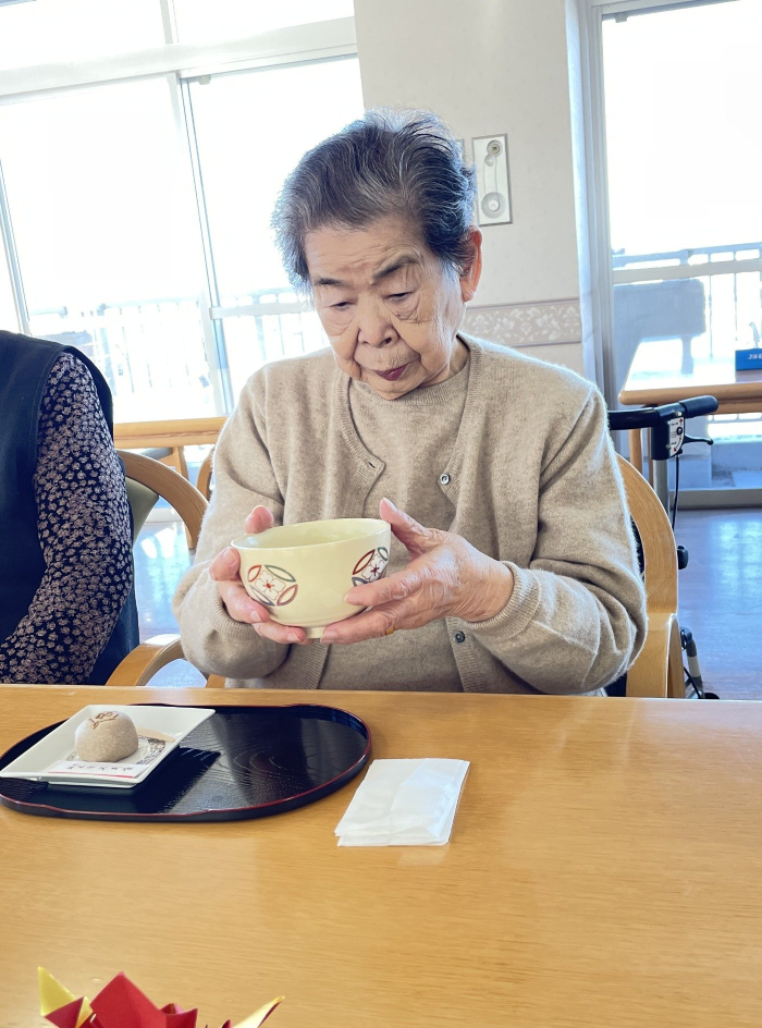 別の日には初釜茶会を行い、お抹茶を楽しんでいただきました。今回は一年の始まりということで干支饅頭を準備し、午年生まれの利用者様のお祝いをさせていただきました。