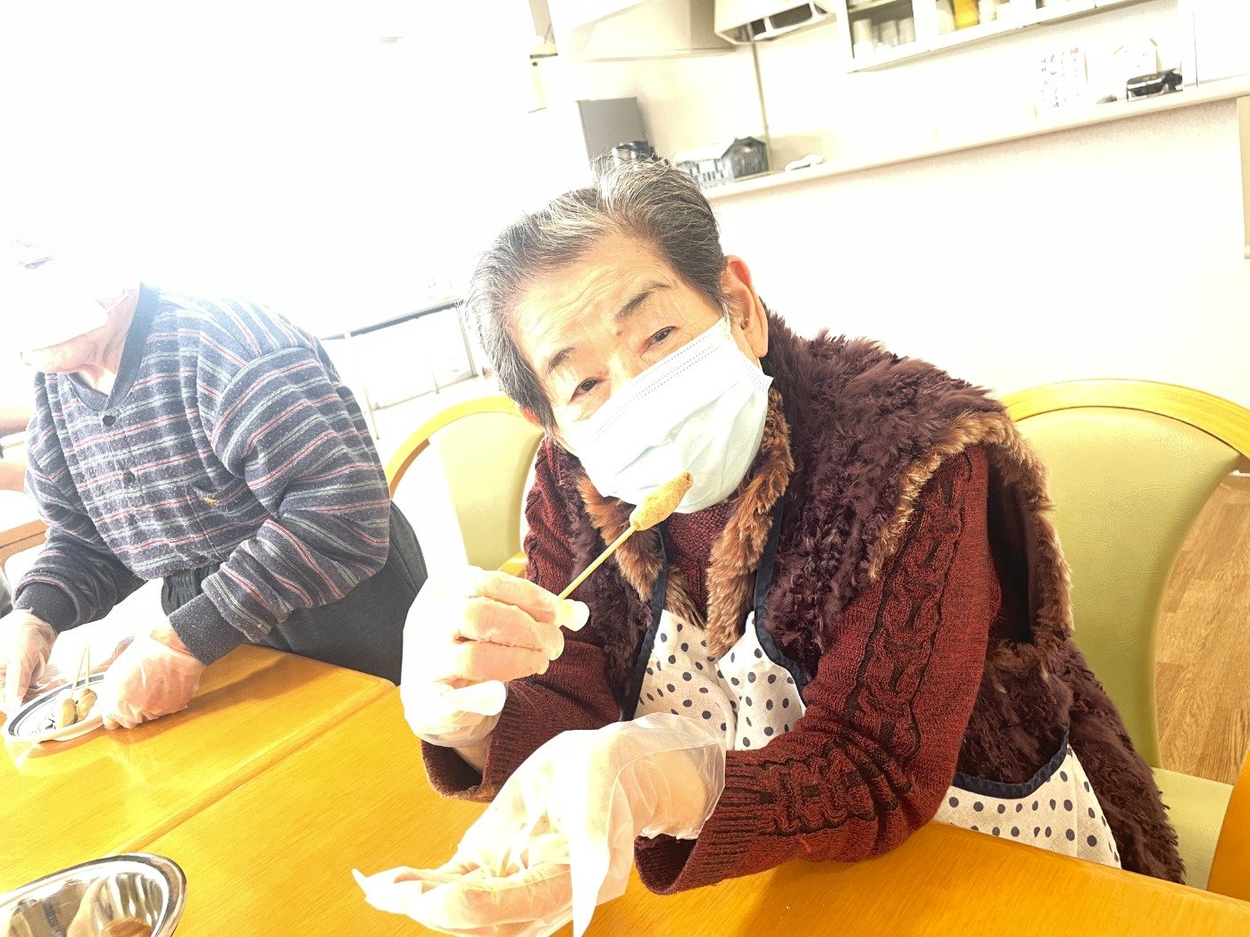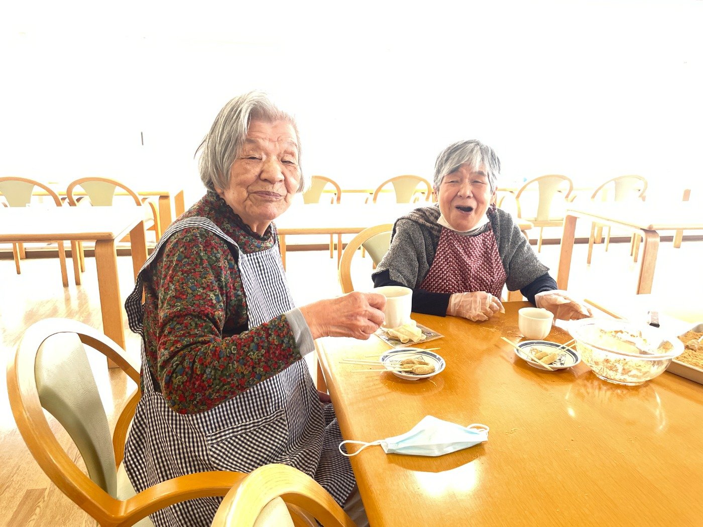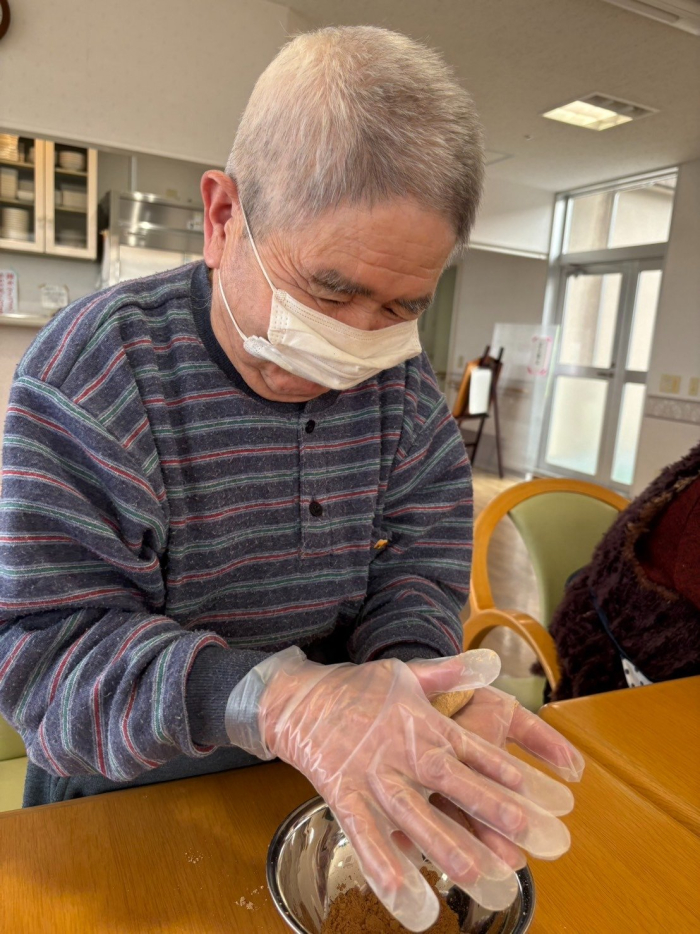 さぬき 2026.01.19 【ケアハウス】お菓子作り 1月も下旬となり寒い日が続きますね。お体は大丈夫でしょうか? ケアハウスでは、昔懐かしのきな粉棒作りを行いました。材料2つで簡単なので、お菓子作りが苦手と言われていた入居者様にも参加していただけました。 溶かした蜂蜜にきな粉を混ぜる工程が力仕事となる為、お互い協力し交代しながら作ってもらいました。 最後はきな粉を塗し、串を刺して完成です。 「きな粉が美味しいね」「昔の味がするわ」と懐かしんでおられました。
