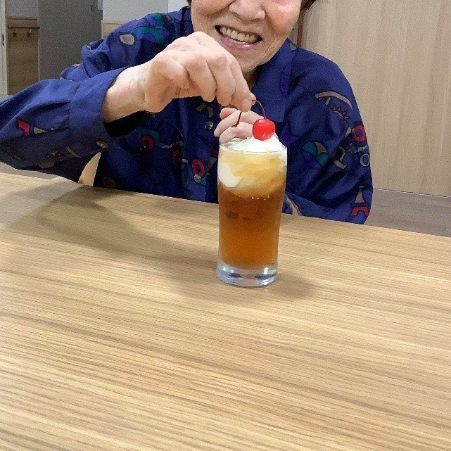 アイスをジュースに浮かべ、さくらんぼを上にのせ、ストローですーっと飲む瞬間の笑顔に、私たちも嬉しくなりました。早くコロナが落ち着き、「お茶」をしにお出かけしたいです♪