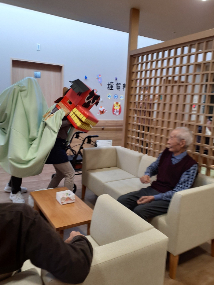 新番丁スクエア 2022.01.01 元旦から大笑い? グループホーム新番丁では元旦の今日、手づくりおせち、おとそ、お正月遊びで新年のお祝いをしました。 ご家族との時間にはおよびませんが、大晦日の夜は介護スタッフと寄り添い過ごし、年明けの昼食には調理スタッフが一品一品丹精込めて作ったおせちを召し上がっていただきました。午後からは、介護スタッフが業務の傍ら制作した小道具で大笑い?していただきました♪