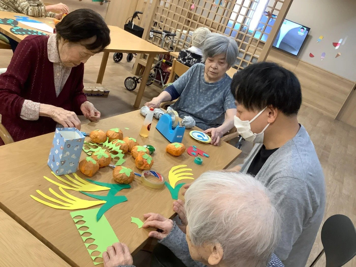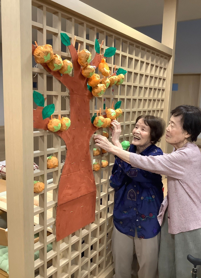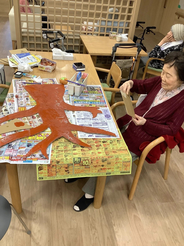 グループホームでは秋と言えば、、と入居者様に尋ねると焼き芋や柿、さんま、スポーツ、金木犀、紅葉など色んな視点で秋を思い出していただきました。今なかなか外出ができない中でどうにか秋を感じてほしいと考えて出てきた案が「一緒に柿の木を作ろう!」でした。