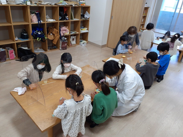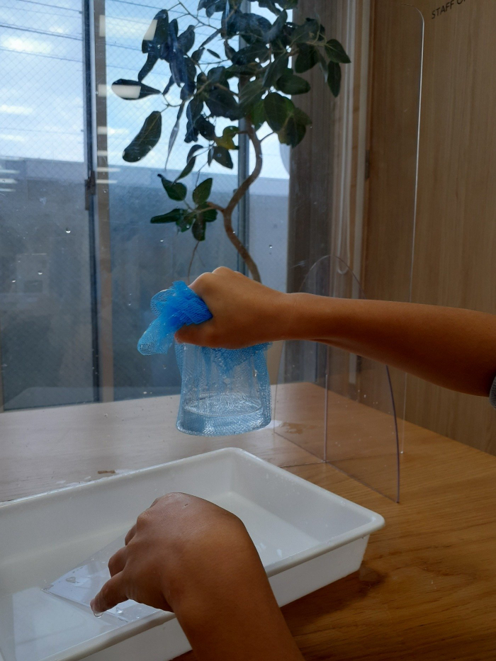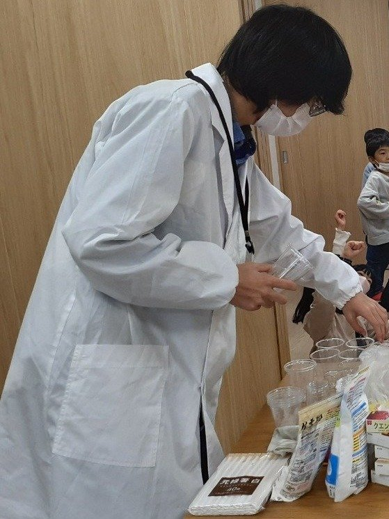 新番丁スクエア 2022.11.29 香川大学生による理科実験教室 まあるでは、11月26日 香川大学生による理科実験教室を行いました。 コップをさかさまにしても表面張力で水がこぼれないことを体験しました。周囲水浸しになりながら、何回もチャレンジ、できた時は大歓声が上がりました。 もう一つの実験は、重曹 クエン酸 片栗粉を混ぜての入浴剤づくりです。赤 黄 緑の好みの色を付け、かわいい入浴剤ができました。