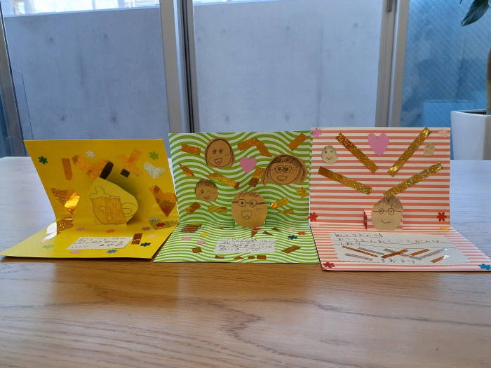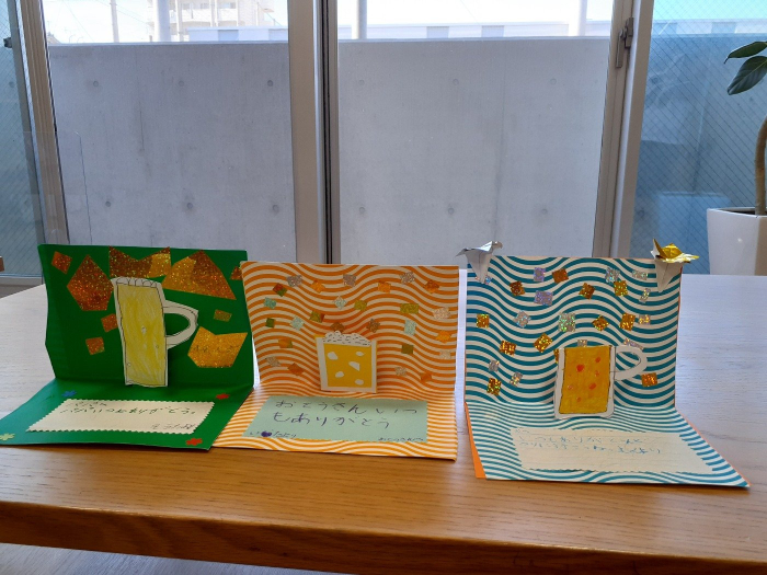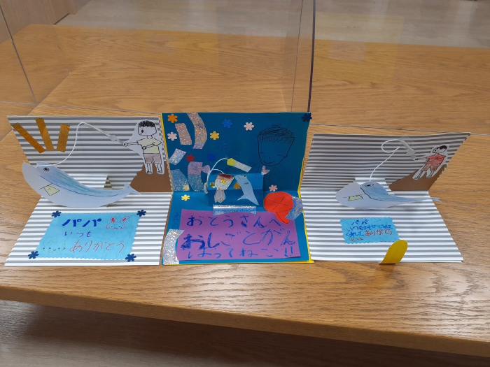 新番丁スクエア 2023.06.28 お父さんありがとう トマト ナス オクラ まあるのお庭で苗を植えました。 「大きくなってね。」「美味しくできるかな。」今から 収穫が楽しみです。 6月の工作教室は、飛び出すカードの父の日のプレゼントづくりです。 先生から説明を受け、まずは台紙選びから、何を飛び出させようかな?お父さんの顔 大好きな魚釣り やっぱりビールかな 愛情たっぷりのメッセージを添えて、素敵なカードがが出来上がりました。