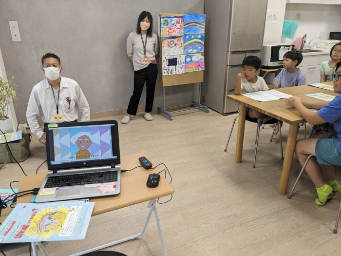 認知症サポーター養成講座の様子です。子供たちが分かりやすいように映像を見せてくれ、話をしてくださいました。