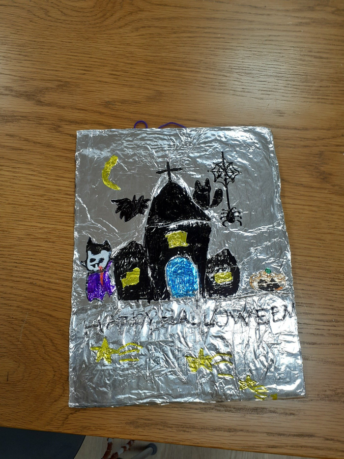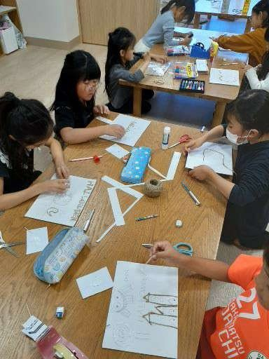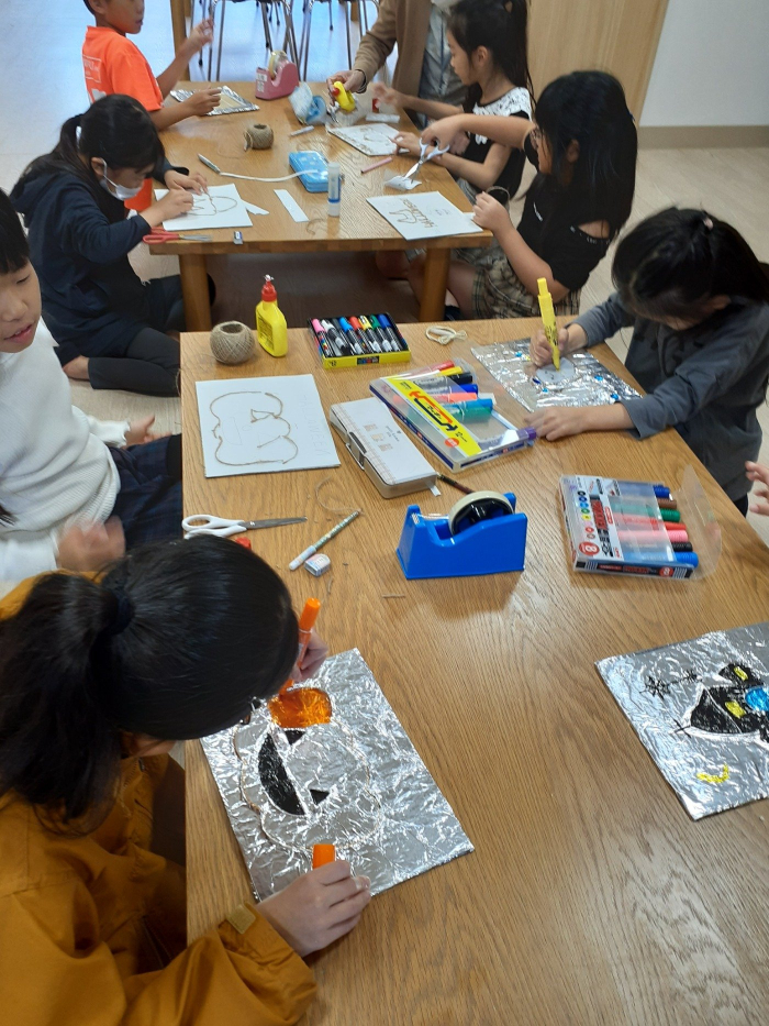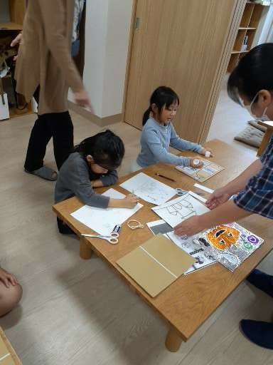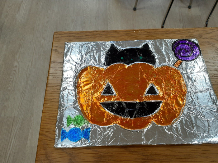 午後は、美術教室でした。今回は、ハロウィンの壁飾りを作りました。