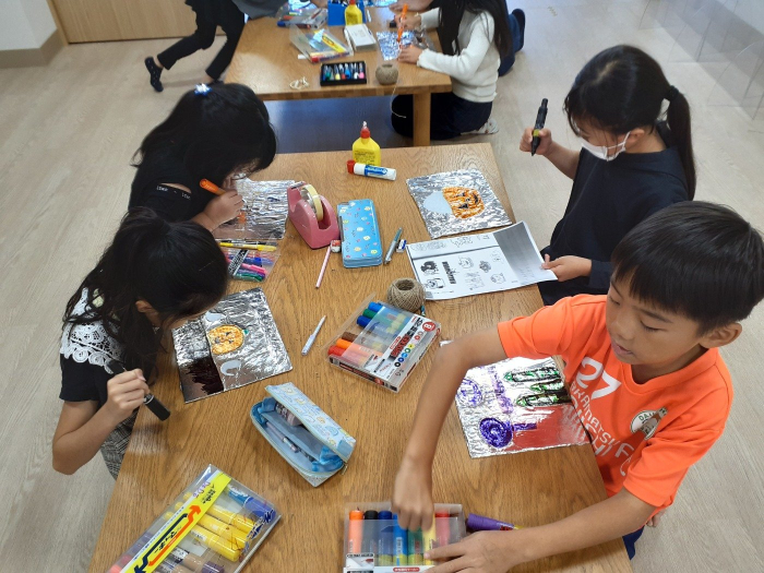 油性マーカーで色を塗っていきます。かぼちゃやおばけ、キャンディー、蜘蛛等、思い思いにデザインを考えて絵を書いていました。