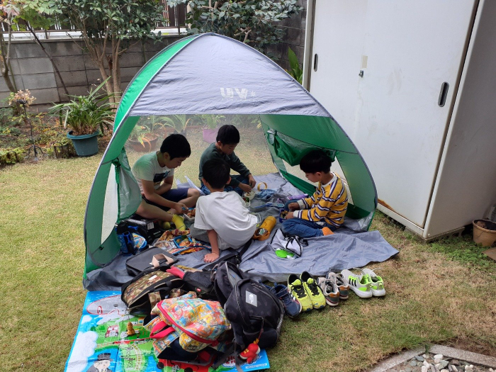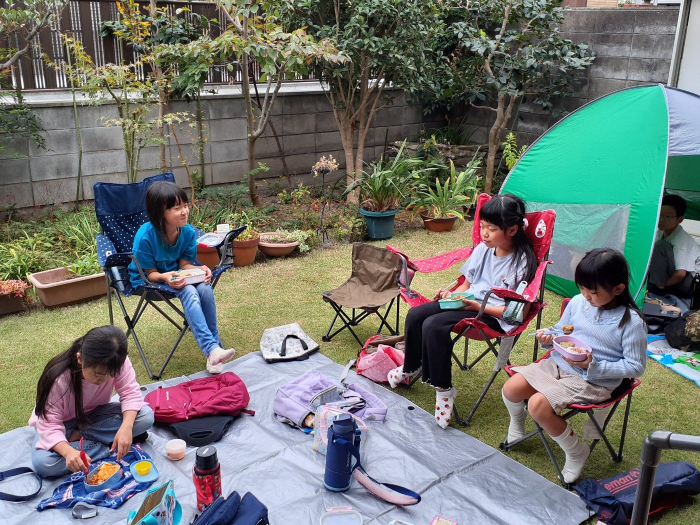 昼食タイムです。外で、お家の中で、テントの中で秘密基地みたいにしてお友達と一緒に楽しく食べました。