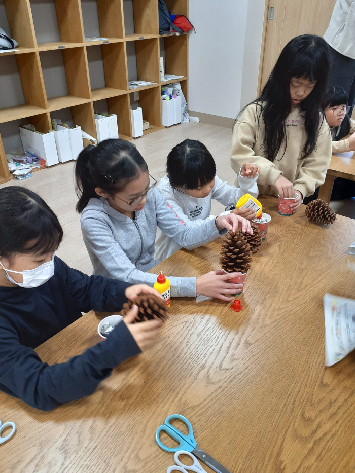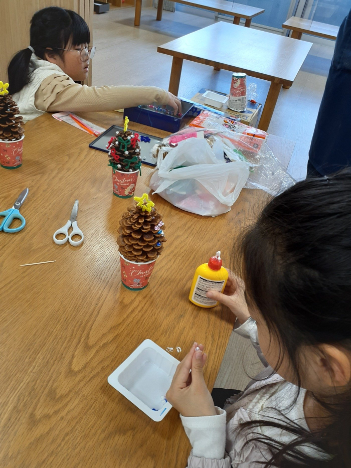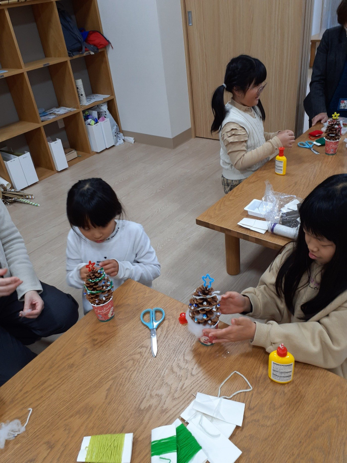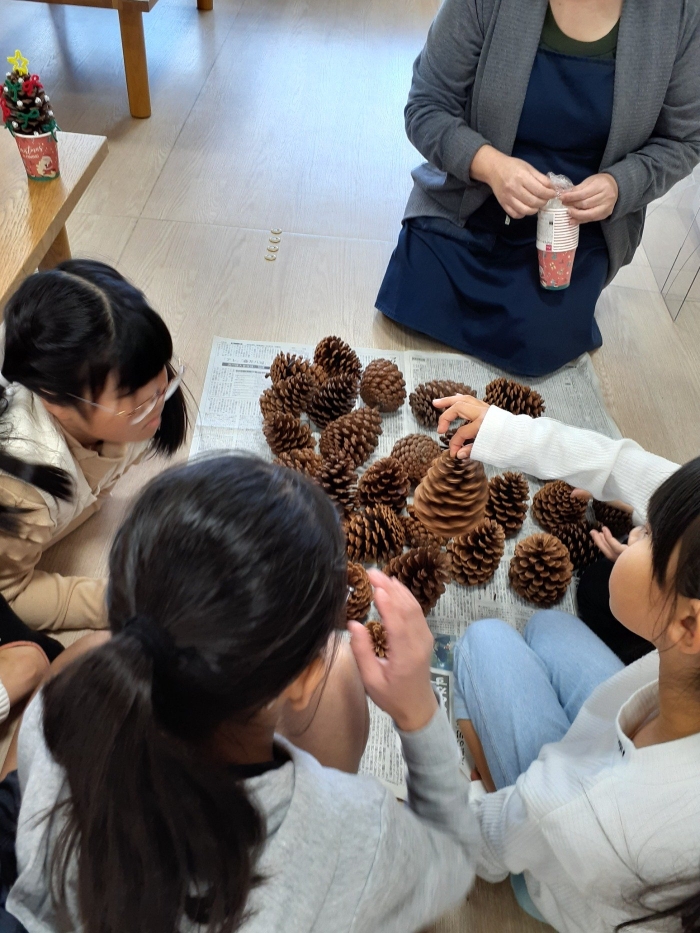 11月の美術教室は、クリスマスツリー作りでした。大きな松ぼっくりを選んで、早速、作業開始です。
