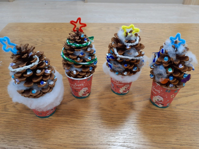 紙コップの上に松ぼっくりをボンドで固定し、ビーズや毛糸、綿等を使って飾り付けをしました。