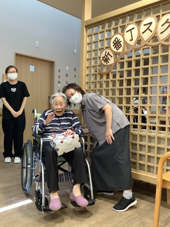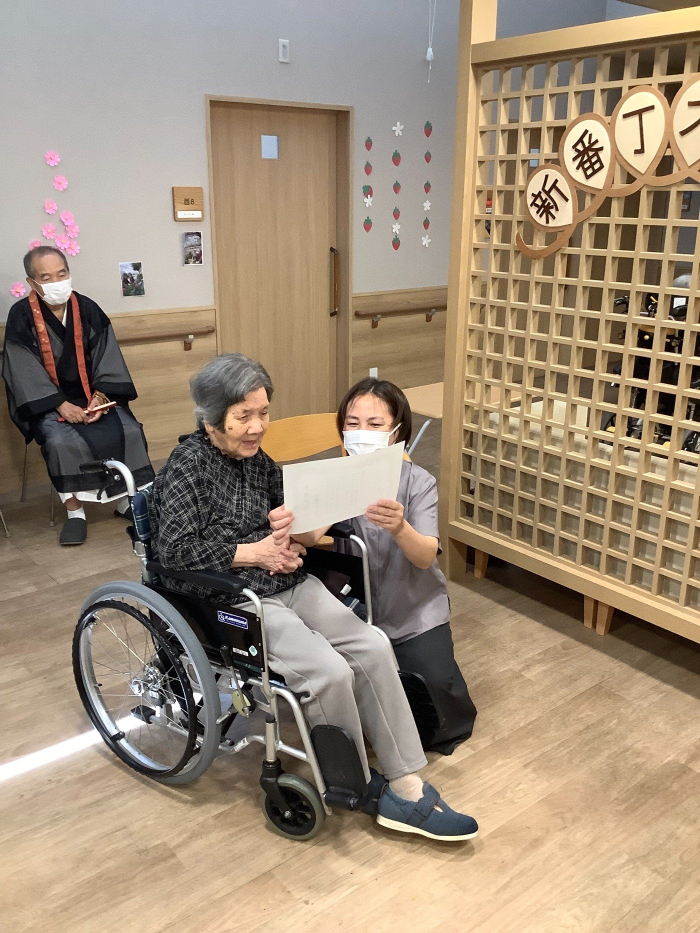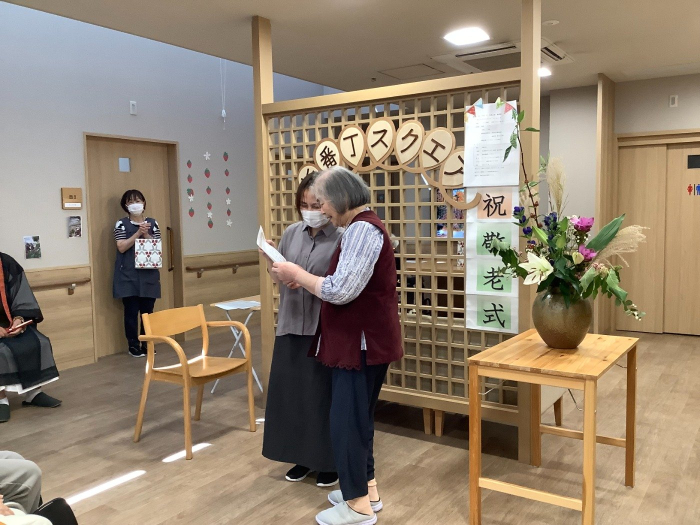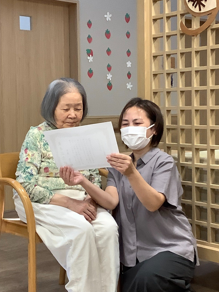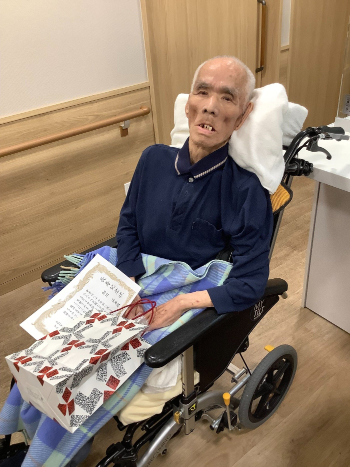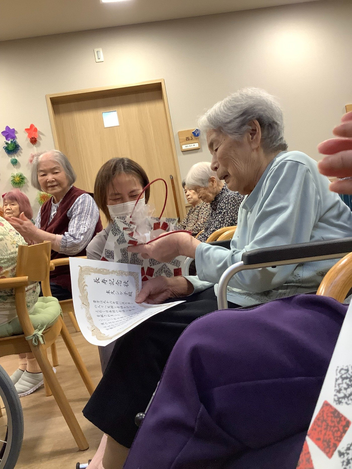 その後は、利用者の皆様一人一人にご長寿の感謝状と記念品が手渡されました。少し緊張されているようですが、和やかなひとときとなりました