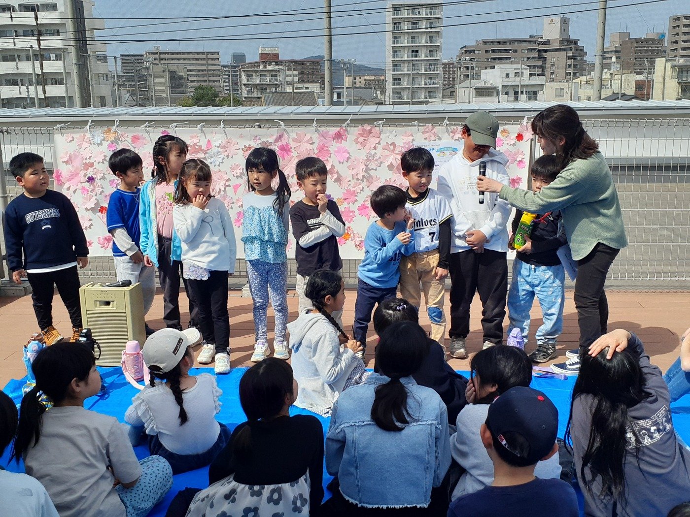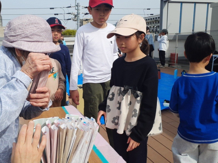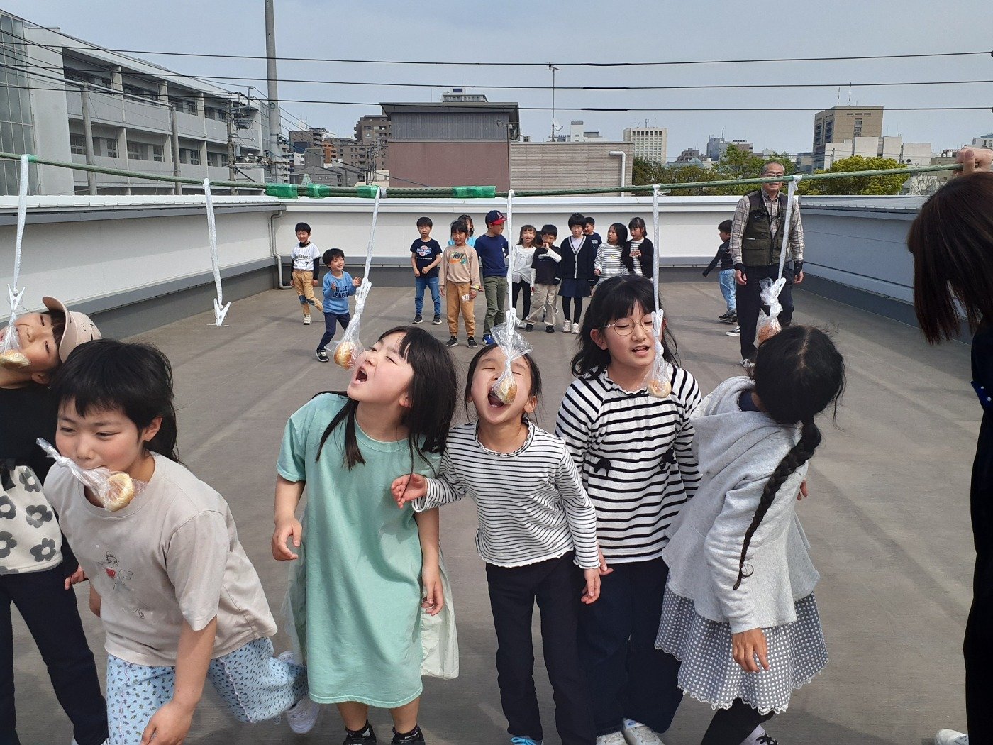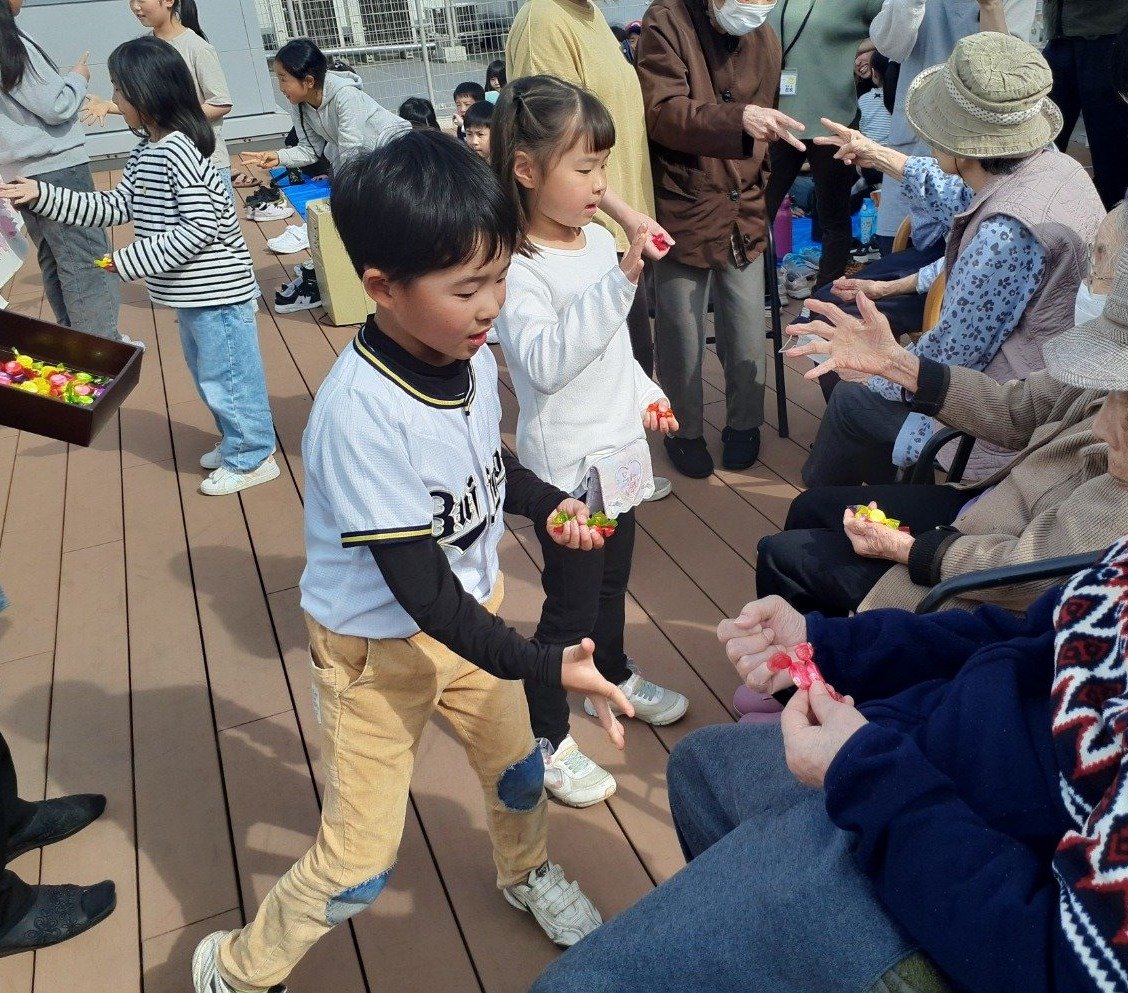 自己紹介をした後は、パン食い競争、お年寄りさんと一緒にじゃんけん大会をしました。パワフル元気いっぱいの子どもたち。屋上で走り回ったり、シャボン玉を飛ばしたりして遊びました。