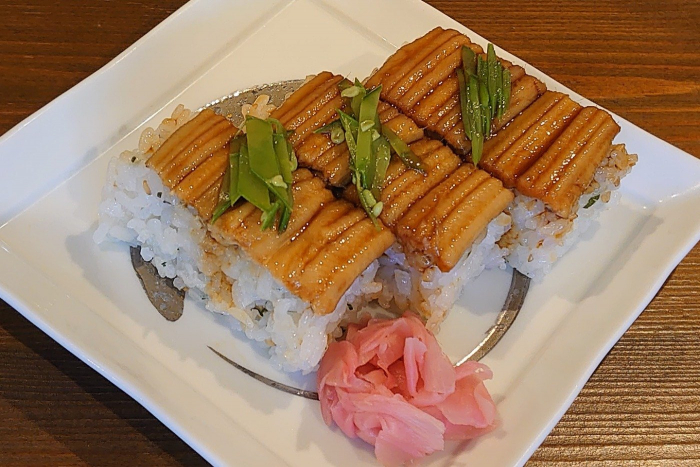 玉藻荘 2021.10.11 穴子の押し寿司 今月のお寿司は「穴子の押し寿司」をしました。 寿司飯の中には、ごまと青じそのみ!!とても好評でした。 ミニ知識 穴子の栄養 穴子はうなぎと比べて、脂質やカロリーが低く、糖質も少ない。しかし、たんぱく質はうなぎと同程度あり、EPAやDHA、ビタミンやミネラルも含まれています。