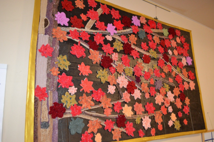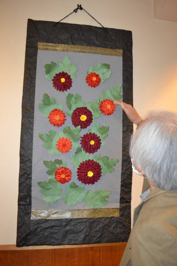 玉藻荘 2021.10.20 デイサービス 秋の作品 デイサービスでは、秋の作品が次々と完成しました‼ 今年の紅葉は、毛糸で編んだものを紅葉の葉っぱの形にして、貼り付けていきます。皆様でバランスを考えながら、声を掛け合い大きな紅葉の出来上がり! 画用紙を丸めて作る、クイリングでは、菊の掛け軸が完成しました。 「本物の菊みたいだね~~」大好評でした‼ デイサービスの飾りつけも、すっかり秋仕様になりました。 随時、見学もお待ちしております!ぜひ、見に来て下さい。