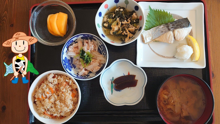 玉藻荘 2021.10.29 第1回目 地産地消 文章 【献立】 ・炊き込みご飯 ・塩焼魚 付)大根おろし ・キャベツの味噌汁 ・小松菜のけんちゃん煮 ・山芋の梅和え ・果物(柿) ・漬物(奈良漬け) 米はこしひかり100%で、鰆や鶏肉、キャベツ、小松菜の香川県産を使い、地産地消の献立にしてみました。今後も地産地消キャラクター「讃太くん」と一緒に毎月第4木曜日 昼食に実施予定です。