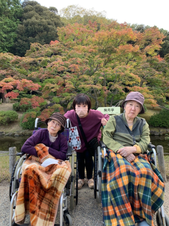 玉藻荘 2021.11.05 栗林公園に行きたい!! 玉藻荘のご長寿、Y様。 9月に、元気に106歳を迎えられました。 お祝いに何かと思い、ご希望はないかと尋ねると 「栗林公園に行きたい!!」と。 気候や体調を見ながら、職員も一緒に、楽しみな気持ちを募らせていました。 そして今日、秋晴れの中、赤や黄色に染まりだした木々を眺めながら、栗林公園を散策してきました。一歩一景、どこを見ても、美しく、「本当にありがとう。来てよかった。」と何度も仰って下さいました。 職員も貴重な時間を共に過ごせ、感謝しかありません(#^.^#) また来年も行きましょうね♪