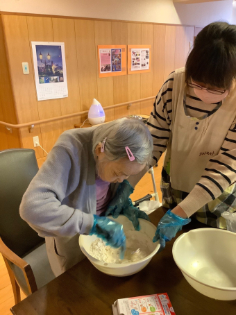 玉藻荘 2021.11.11 パンケーキ食べたい♪パンケーキ食べたい♪ 今日は午後から6階フロアで、利用者さんと一緒に「おやつレク」を行いました。 生地を混ぜて、ひっくり返してもらうことで、手のリハビリにもなりました(≧▽≦) 「自分たちで作ったおやつは、いつもよりおいしいね」と皆さん笑顔になっていました。 今度は何を作ろうかなぁ~??