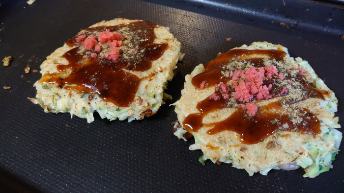 玉藻荘 2021.11.24 リビングに拡がるお好み焼きの良い香り♪ 今月は要望も多かった、【お好み焼き】を特養で行いました。どこのユニットでもお好み焼きの美味しそうな香りが漂っていました。肉やイカやえびもたくさん入りとても好評でした。ミンチやムースもお好み焼きを形状を変えて提供し好評でした。