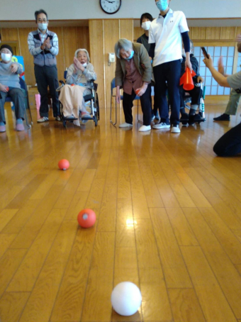 玉藻荘 2021.11.30 運動会!! 秋の恒例、『玉藻荘 大運動会』が開催されました。 今年は、新競技、ボッチャにチャレンジ!! 玉藻荘独自のルールを考え、二チームに分かれて、白の目標球にどちらがより近く投げることが出来るか… 皆さん、初めてながらも、しっかりと的を狙い、「さすが!!」「惜しい!!」「やった!!」と盛り上がりました。 利用者さんも職員も、いい汗かいて、笑顔で楽しいひと時を過ごせました(#^.^#)