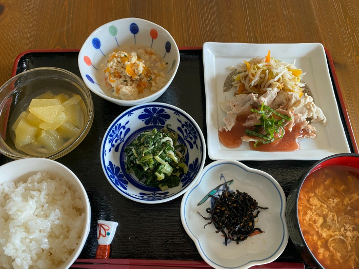玉藻荘 2022.03.29 地産地消 【献立】 ・ご飯 ・ゆで豚の梅香味だれ 付)もやし ・かき玉汁 ・炒り豆腐 ・青菜のしらす和え ・コンポート(りんご) ・佃煮 豚肉は香川産、キャベツは三豊市、椎茸は塩江町、青菜は郷東町等、今回も沢山の地場食材を使った献立にしています。“生産者の皆さん、ありがとうございます” これからも美味しく調理して、入居者様に届けます!