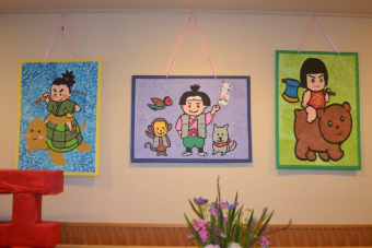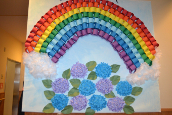 玉藻荘 2022.05.13 デイサービス☆趣味活動 5月のデイサービスの作品です☆ 「さんたろう」という言葉を聞いた事がありますか? 「浦島太郎」「ももたろう」「金太郎」を合わせて「さんたろう」と呼ぶみたいですよ~!! 今回はその「さんたろう」をちぎり絵で制作しました。細かく画用紙をちぎって貼り付け、皆様で力を合わせ完成させた作品です! 紫陽花と虹の作品もこれからの季節にぴったりですね~♡