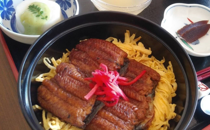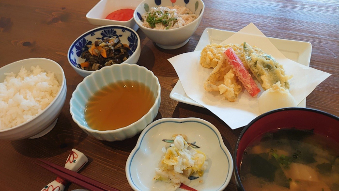 玉藻荘 2022.07.28 【 地産地消 】 【献立】 ・ご飯 ・キスの天婦羅 天つゆ ・麩の味噌汁 ・そうめんの梅和え ・茄子の浸し ・ゼリー その他に、土用の丑の日に国産うなぎを使って、【うな丼】を作りました。 とても好評で、喜びの声を沢山頂きました。