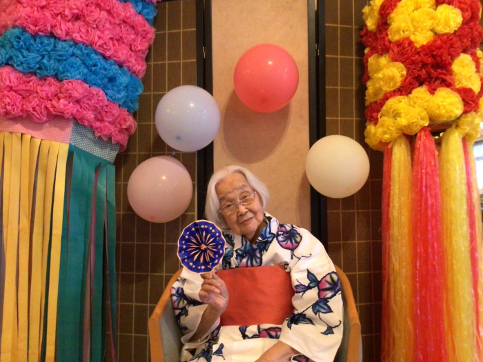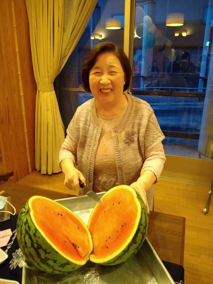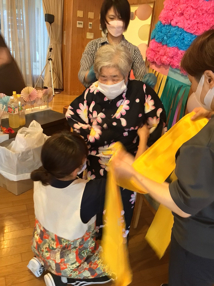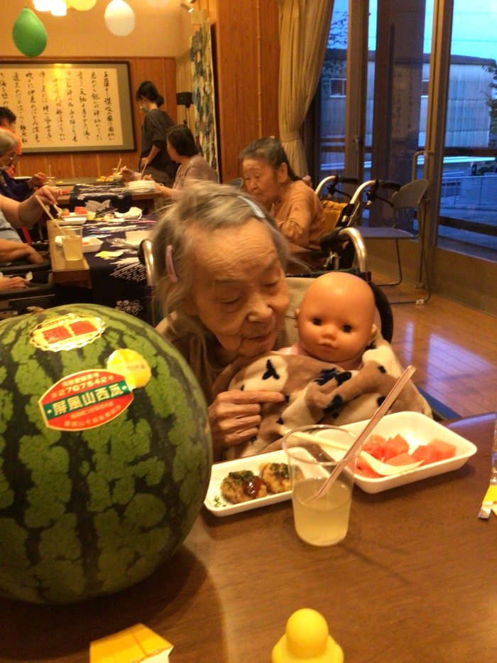 玉藻荘 2022.09.15 夕涼み会 夕涼み会を開催しました。 軽食にはたこ焼き、ジュースの他、今年は大きなスイカがやってきました。 顔より大きなスイカの登場にみなさん「おぉ~~」と大喜び。 代表の御利用者が上手に一刀両断。更に「おぉ~~」と歓声が。 外では手持ち花火。 浴衣の着付けで写真撮影も喜ばれました。
