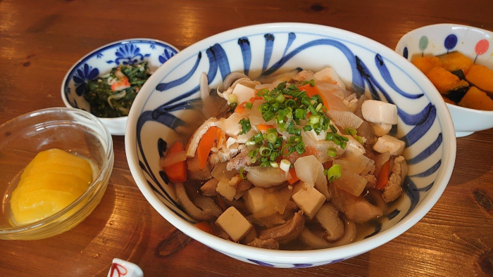 玉藻荘 2022.12.22 【 地産地消 】 【献立】 ・冬至そば ・かぼちゃの土佐煮 ・春菊の味噌和え ・果物(ゴールドキウイ) 《産地紹介》鶏肉(香川産)・大根(坂出)・生椎茸(塩江町)・細ねぎ(上福岡町)・春菊(三木町)・ゴールドキウイ(三豊) 冬至が過ぎれば、少しずつ日が長くなってきます。とはいえ、寒さはこれから本番ですね。かぼちゃと柚子湯で、冬を乗り切りましょう!!