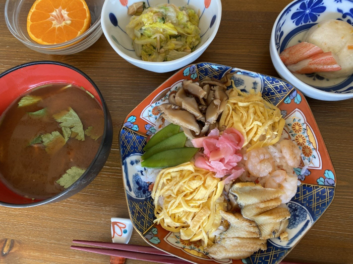 玉藻荘 2023.01.26 【 地産地消 】 【献立】 ・ばら寿司(里芋入り) ・赤だし汁(豆腐) ・煮物 ・白菜のなめたけ和え ・果物(みかん) *今日の産地は、精白米(こしひかり100%)・里芋(塩江町)・金時人参(坂出)・鶏卵(綾川町)・白菜(綾南町)・みかん(王越町)を使いました。地産地消の食材とお寿司という事もあり、より一層喜んで頂けました。