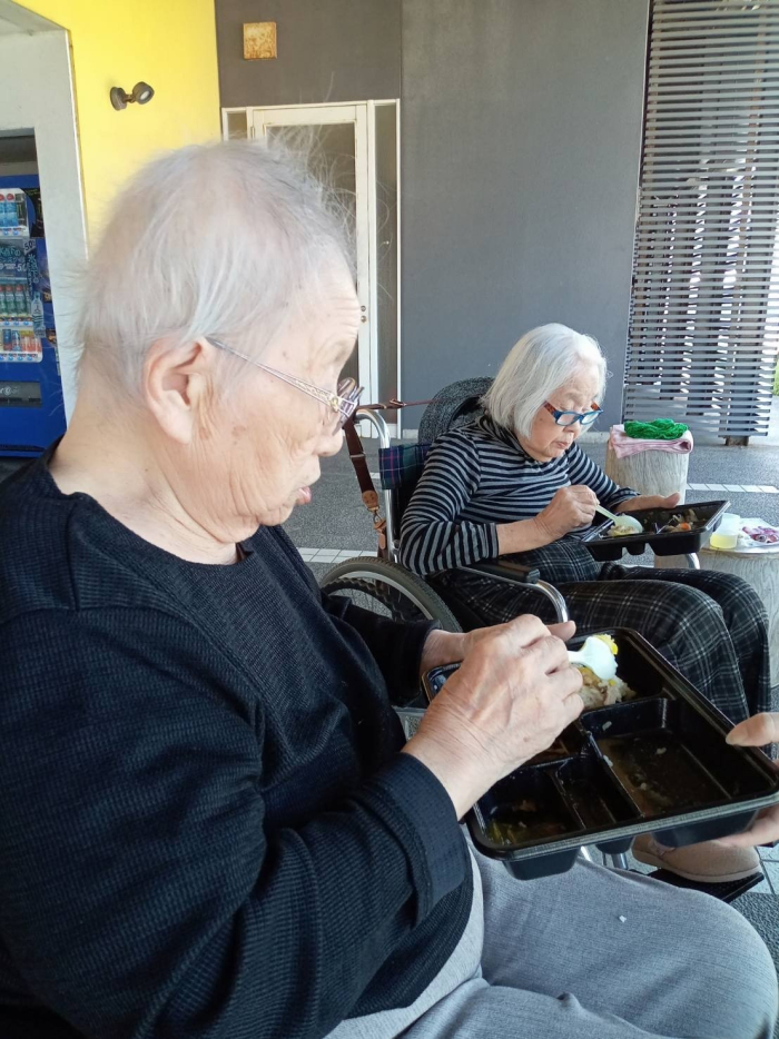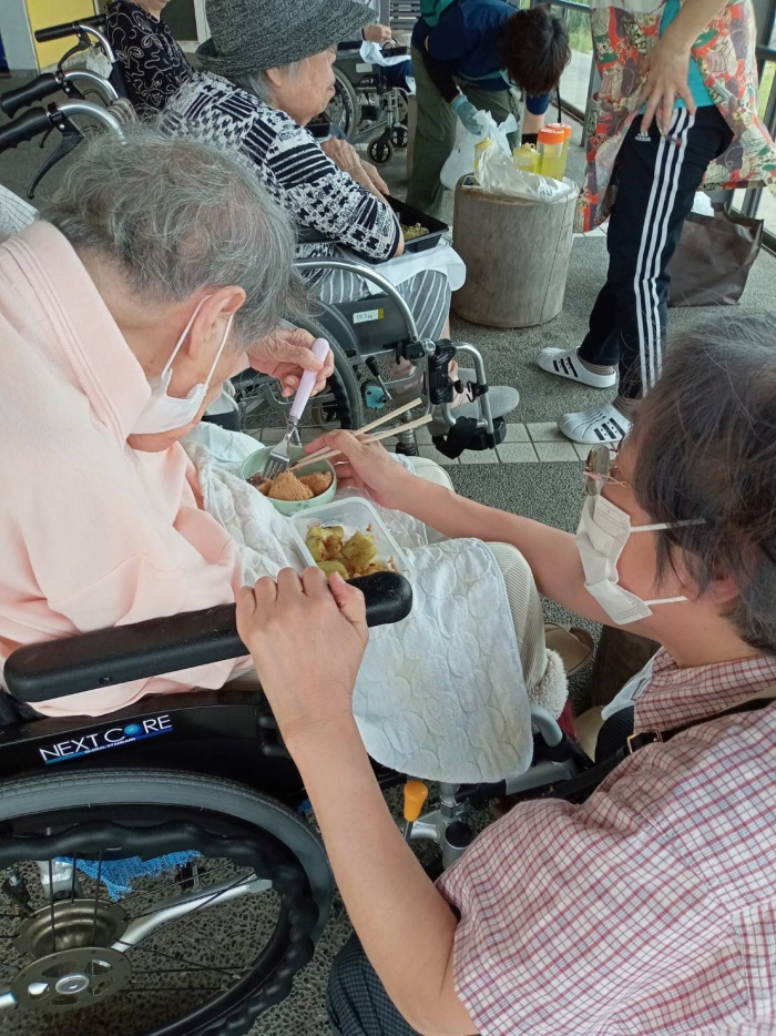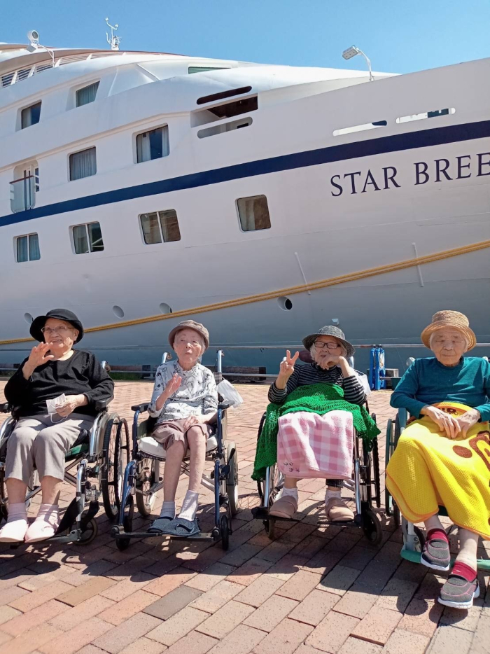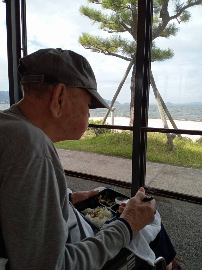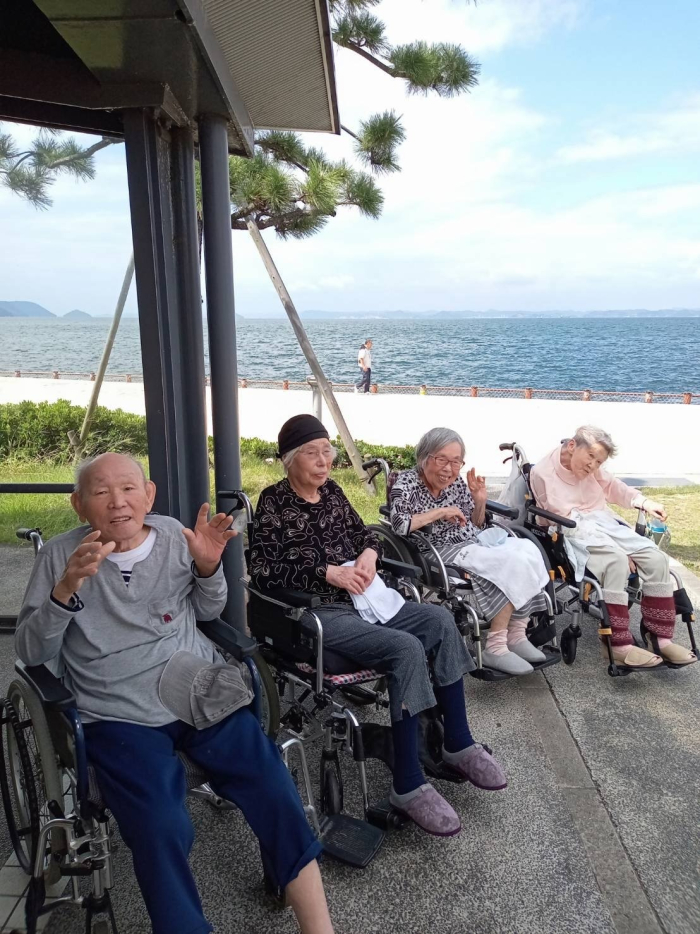 玉藻荘 2023.09.29 ピクニック!! 今日は天気も良かったので、サンポートへ外出してきました。 たまには、お外で食事をしたいとのご要望もあり、たまも荘手作りお弁当を持ってお出かけです。 海を眺めながらの食事は気分も晴れ格別な美味しさです。 お家が近いご家族様は、手作りのお料理を持って参加してくださいました。 たまも荘のお弁当もいいけど、やっぱり我が家の食事が一番ですね! 食事の後はおやつを食べたり、潮風にあたりながら散歩を楽しみました。 帰りにみんなで記念撮影!!