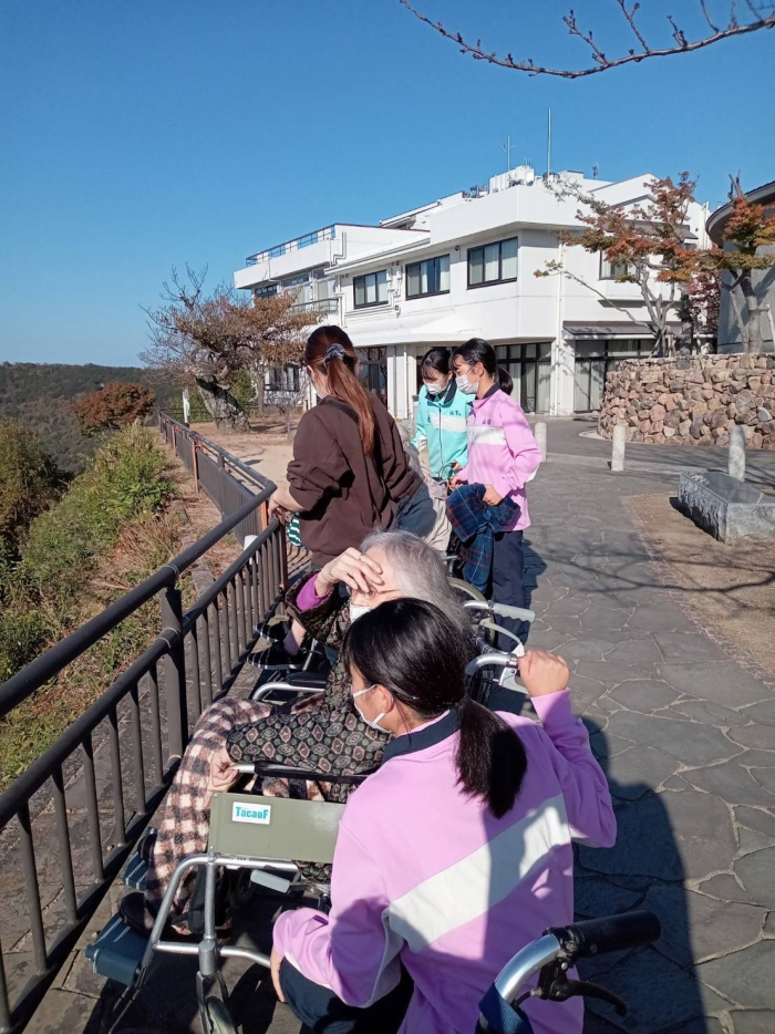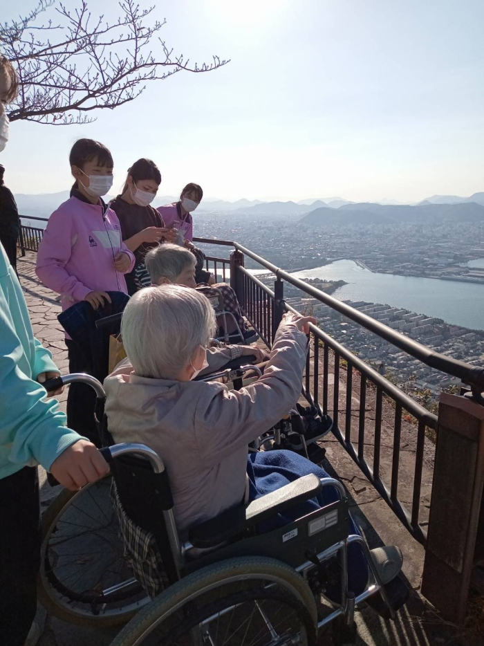 玉藻荘 2023.11.05 秋のドライブ 今回のドライブは、屋島山頂にある「やしまーる」さんへ行ってきました! 綺麗な海を遠くまで見渡せて、気分も晴れやかになりました。 今回は実習生さんも一緒に参加してくれていたので、皆でワイワイはしゃぎながら散策が出来ました。 「あそこらへんにうちんくがあるんかなぁ~?」 「うちんくはどこやろか~?」 そんな会話も楽しみながら久々の外出を満喫できていました。 山頂で休憩しながら、「次はどこ行こうかな~?」 お次は紅葉が楽しめるところが良いですね!