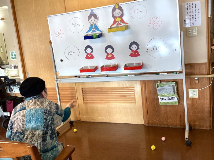 みんなで作ったひなあられをイメージした白、ピンク、黄、黄緑の4色の玉8個をひな壇ボードのかごに投げ入れてもらいました。