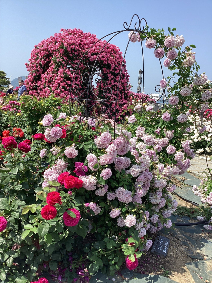 サンポートのバラ園が見頃を迎え、連日バラを見に来たたくさんの人たちで賑わっていますね。