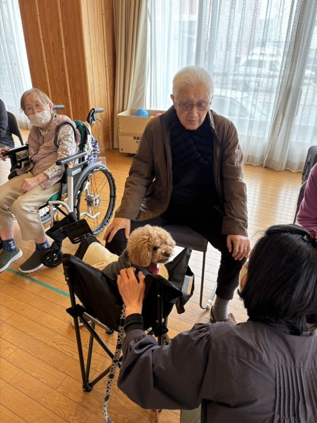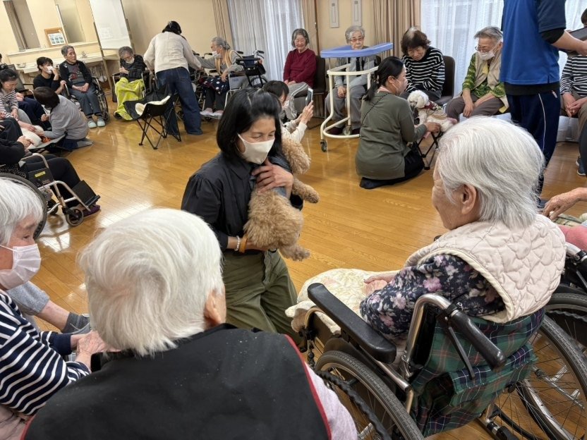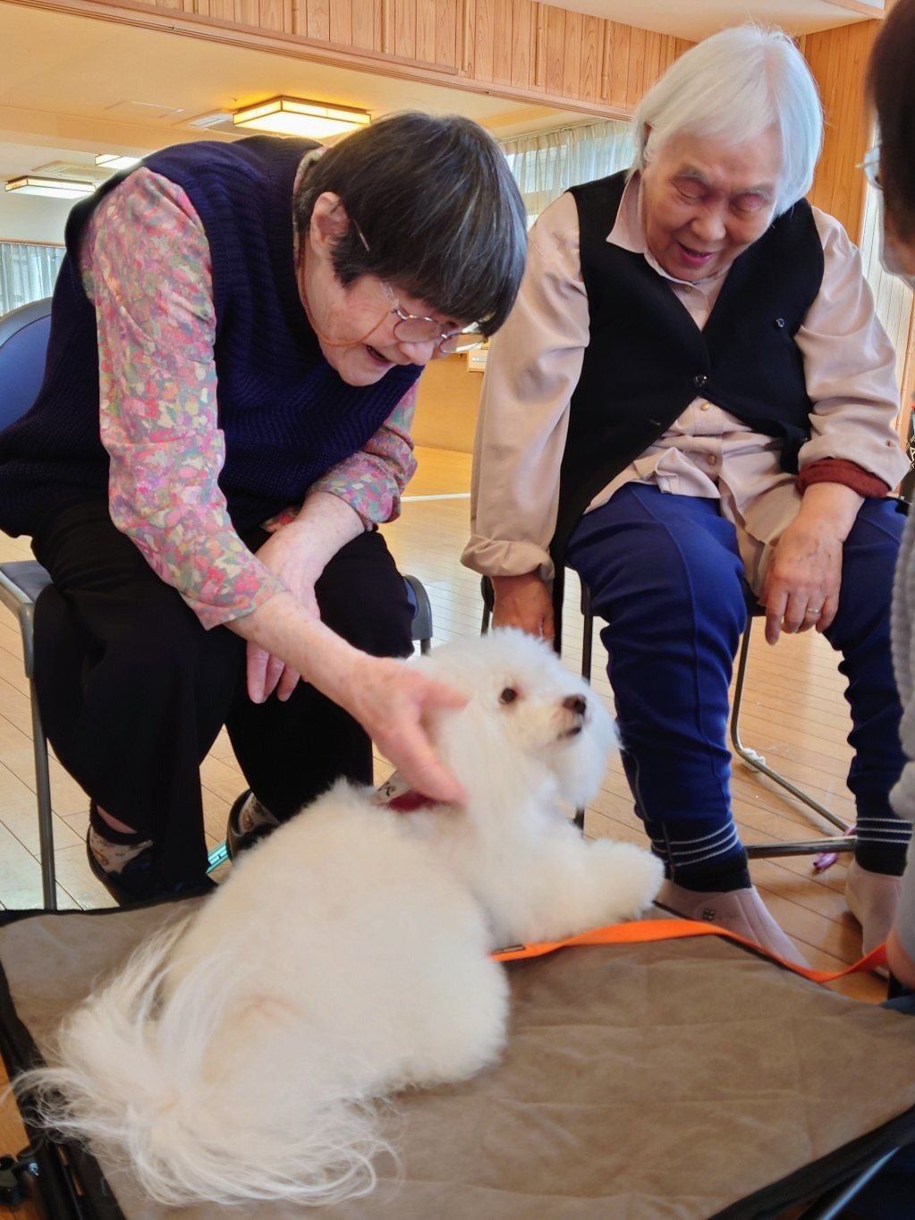皆さんのところへ順番にワンちゃんたちが来ると、皆さん嬉しそうに頭をなでたり飼い主さんと楽しくお話をされました。