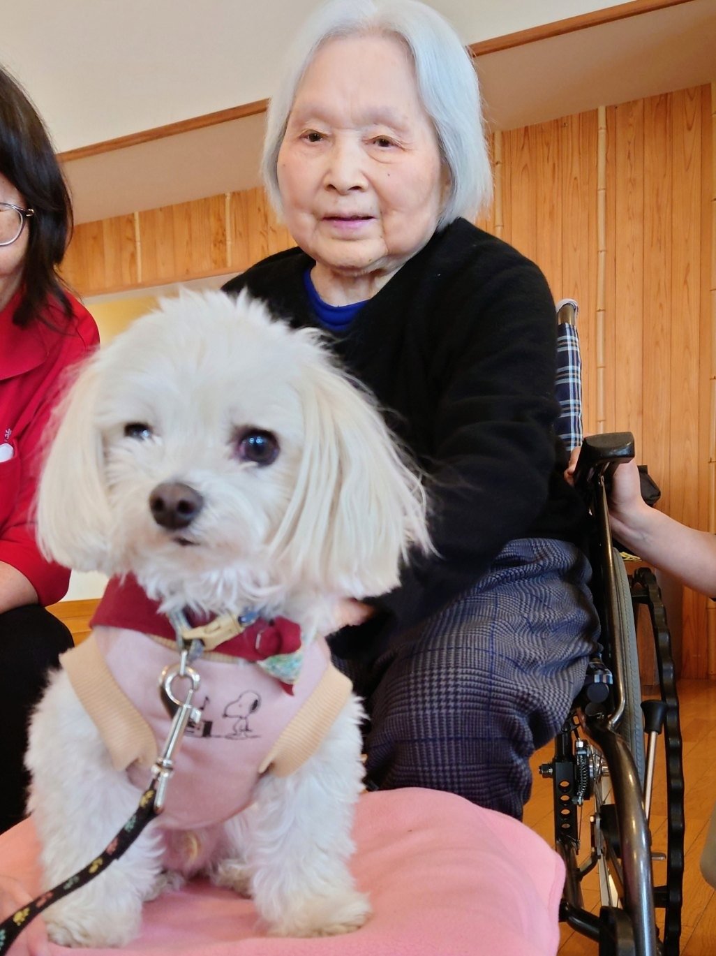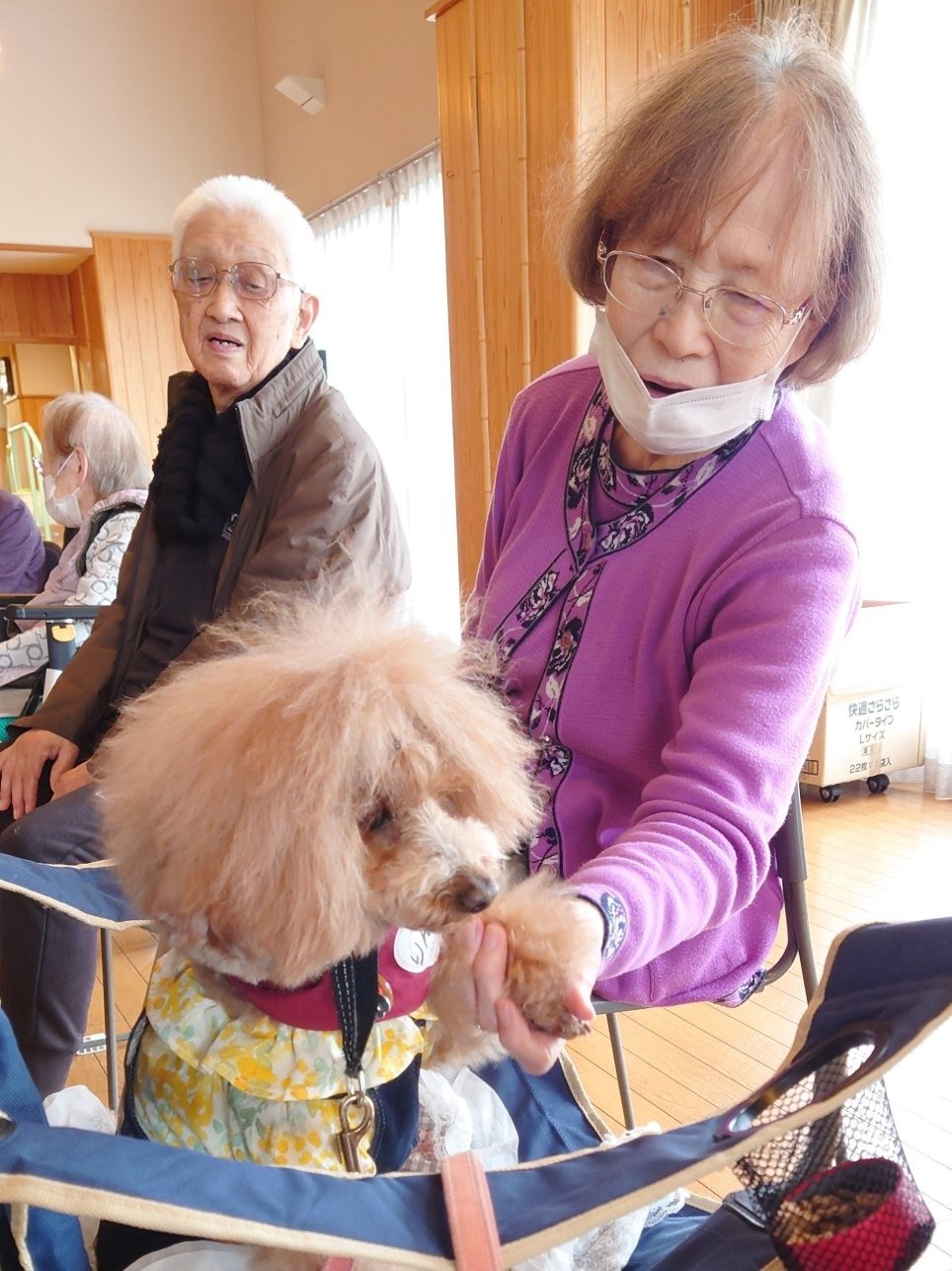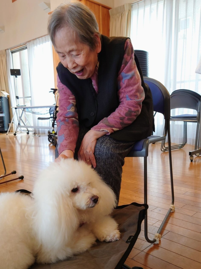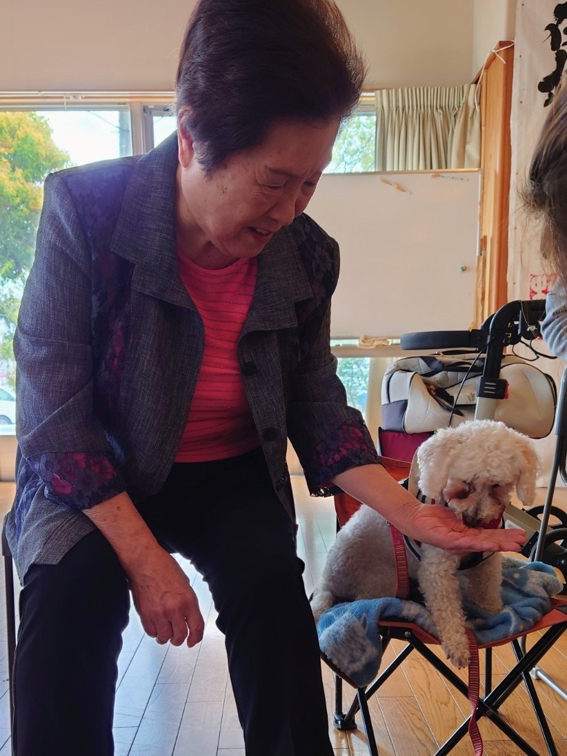 また、ご利用者の中には「子供のころに近所の犬に吠えられて怖い思いをした」とふれあいに不安を抱いていた方もおられましたが、飼い主さんと話をしながらゆっくりとワンちゃんの頭をそーっとなでられ、「おとなしい子や、初めて犬に触ったわ」と嬉しそうに話されていました。