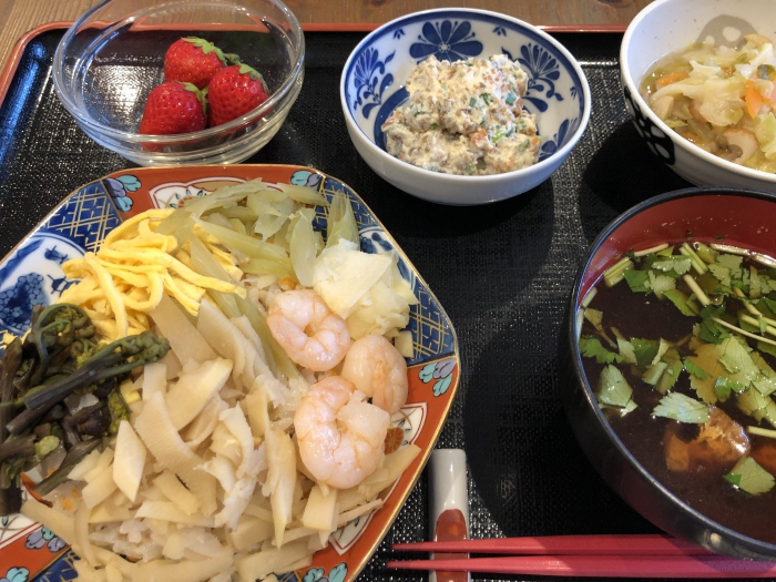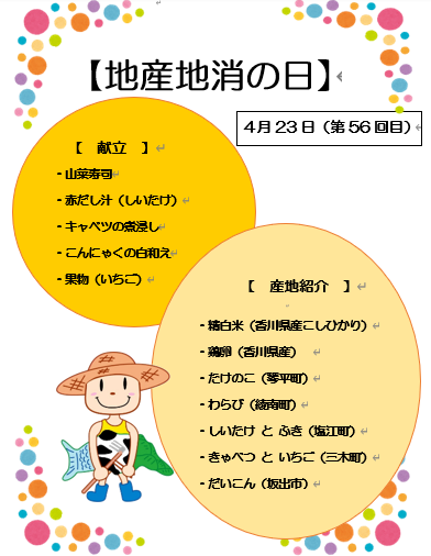 玉藻荘 2026.04.23 4月の地産地消 毎月第4木曜日の昼食は地産地消の日です。本日の献立は山菜寿司です。 ポスターの通り、お米はもちろん、筍・わらび・ふき・いちごなど、 香川県産の食材をたくさんご用意出来ました。 また、嚥下状態の関係で、お寿司ではなく、お粥を召し上がる方には、 4/20解禁となった瀬戸内海の鰆を塩焼きにしてご用意しました。